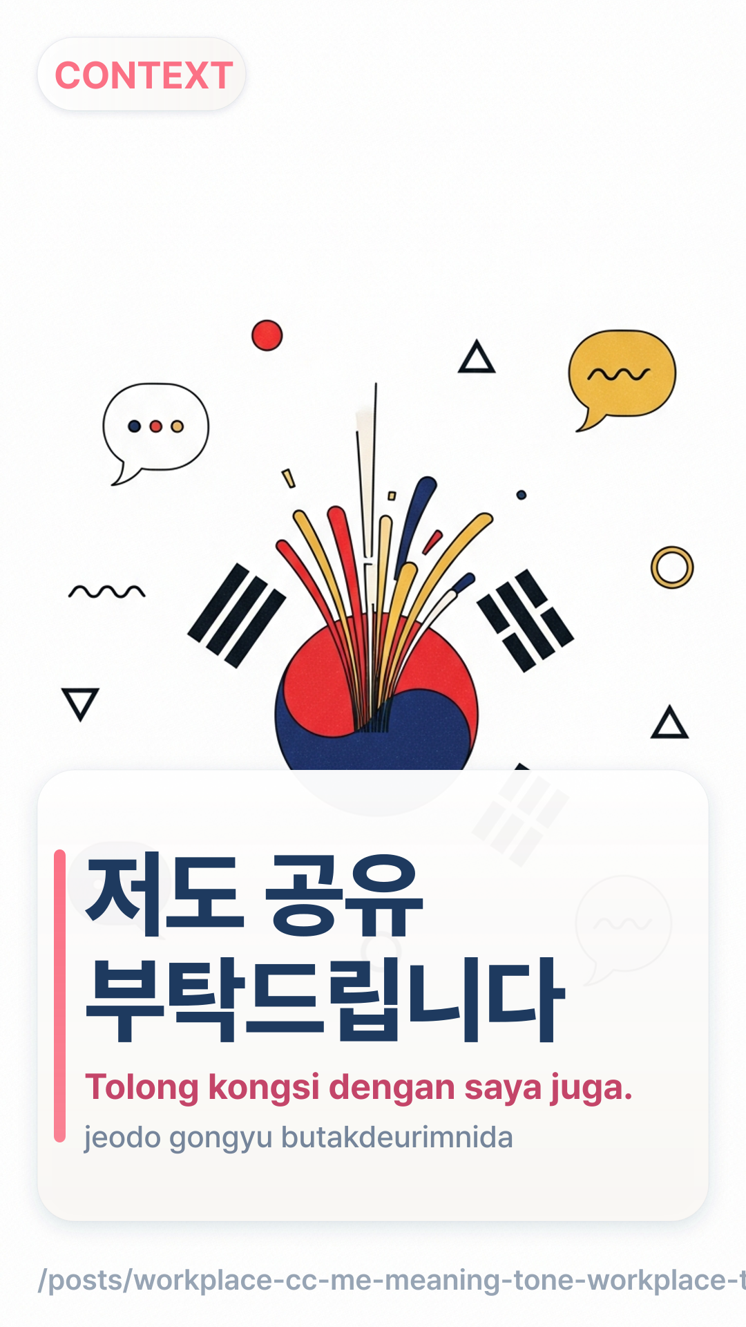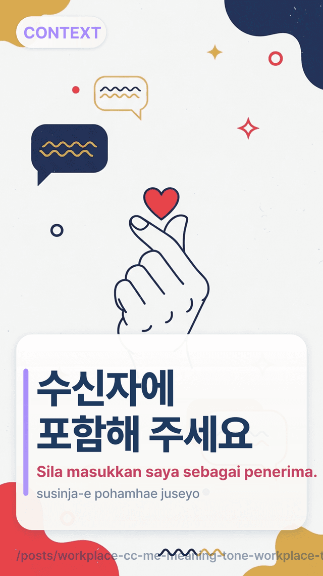 Ini rujukan peribadi saya: minggu pertama saya di pejabat Korea, saya bawa tabiat Inggeris yang blunt (“Please CC me”) ke dalam Korea secara terlalu literal dan hasilnya kedengaran kaku. Seorang rakan kemudian ajar default yang lebih lembut: minta dimasukkan “untuk rujukan,” dan ucap terima kasih.