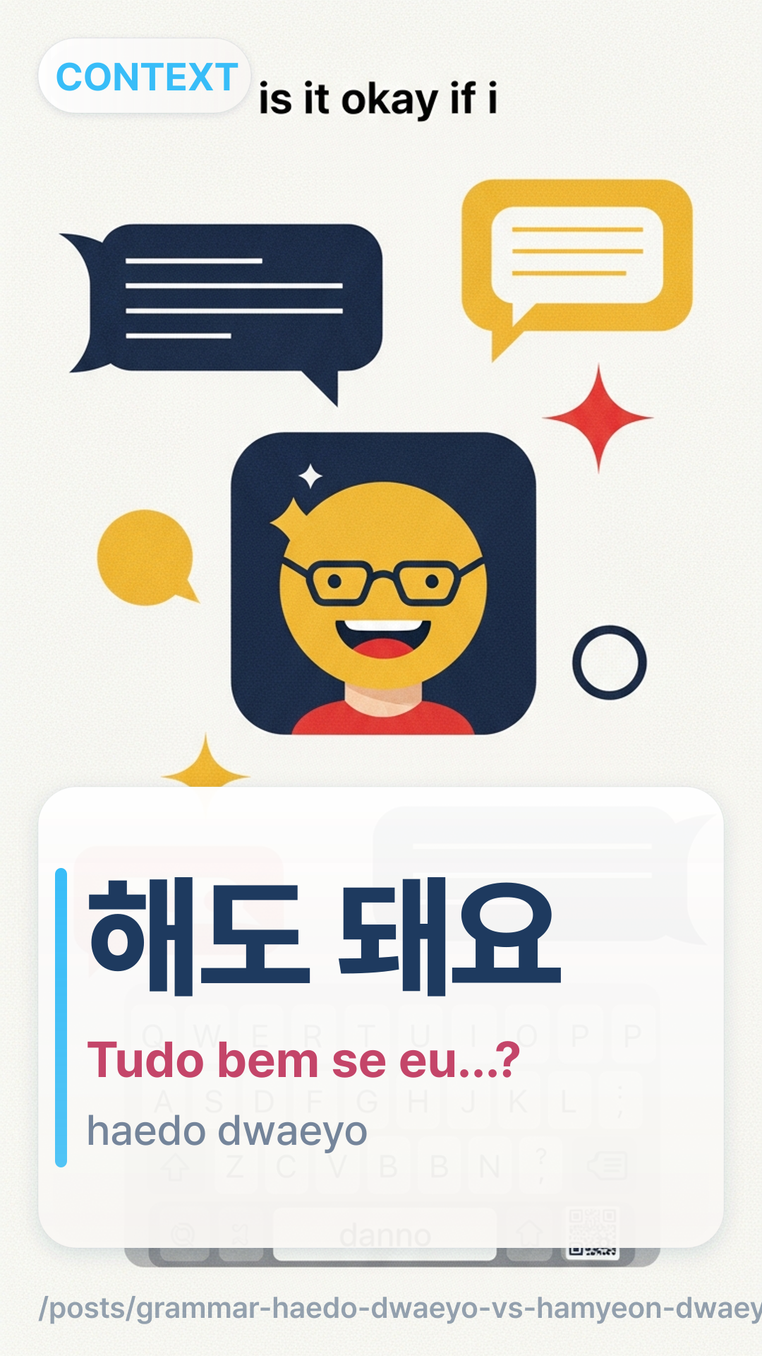 해도 돼요haedo dwaeyo é o seu padrão seguro quando a aprovação do ouvinte importa: sentar, tirar fotos, usar algo, sair mais cedo, ajustar regras. A ideia‑chave é permissão, não “como fazer”.