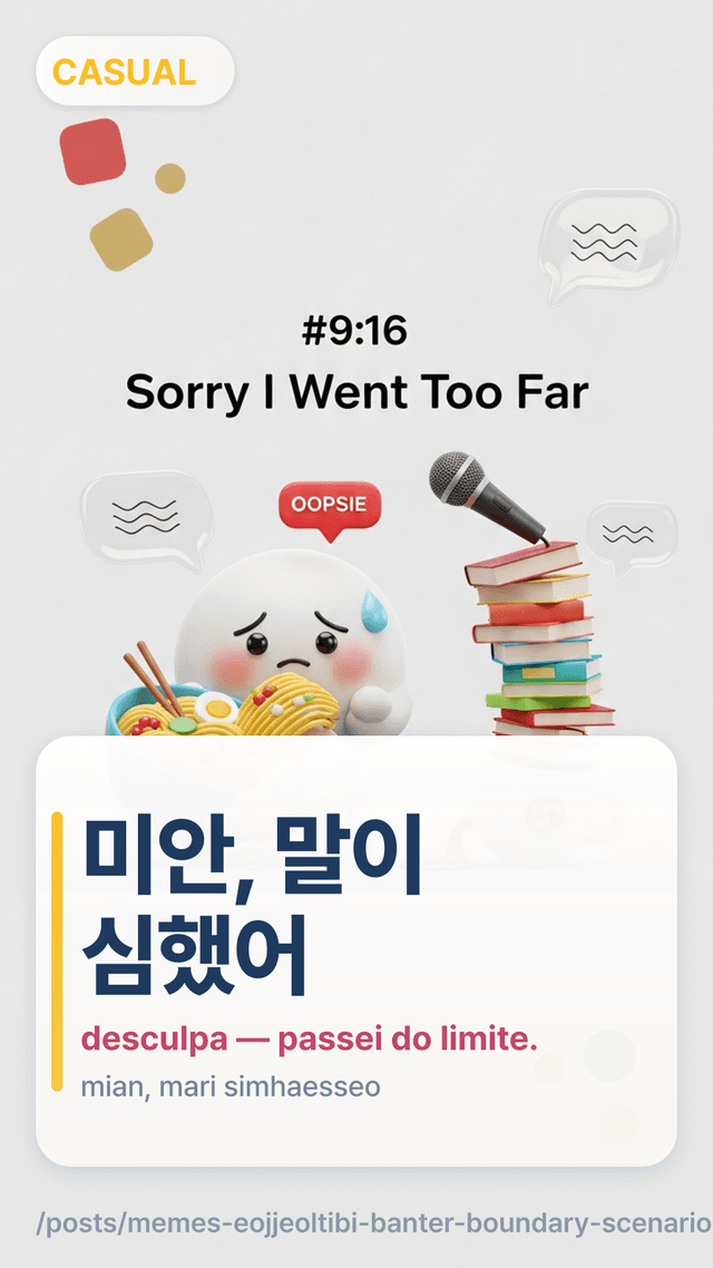 Essa frase de reparo admite que você exagerou sem justificar demais. Funciona muito bem logo após um limite como 그만해geumanhae ou 선 넘네seon neomne. A armadilha é já emendar desculpas; primeiro, mantenha curto.