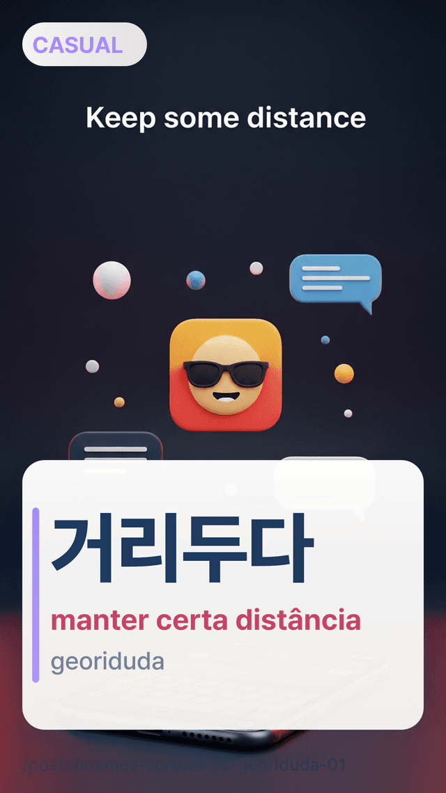Uma armadilha comum: aprendizes usam 거리두다georiduda para dizer “bloquear.” Coreanos normalmente entendem como “manter uma certa distância”, não “apagar a pessoa da existência”.