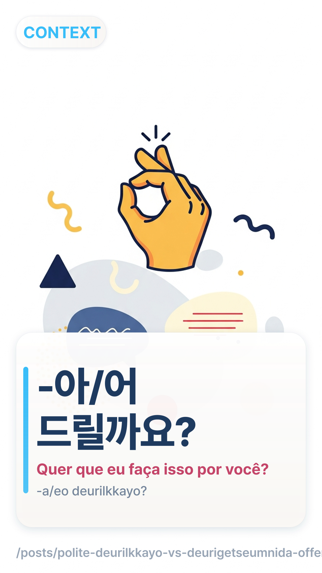 Uma pequena observação cultural: em muitas situações de serviço na Coreia (cafés, clínicas, entregas), a equipe costuma oferecer o próximo passo com essa forma. A primeira vez que ouvi 확인해 드릴까요?hwaginhae deurilkkayo? em uma clínica, pareceu “Tem certeza?” em inglês. Não era. Era simplesmente “Quer que eu verifique para você?”