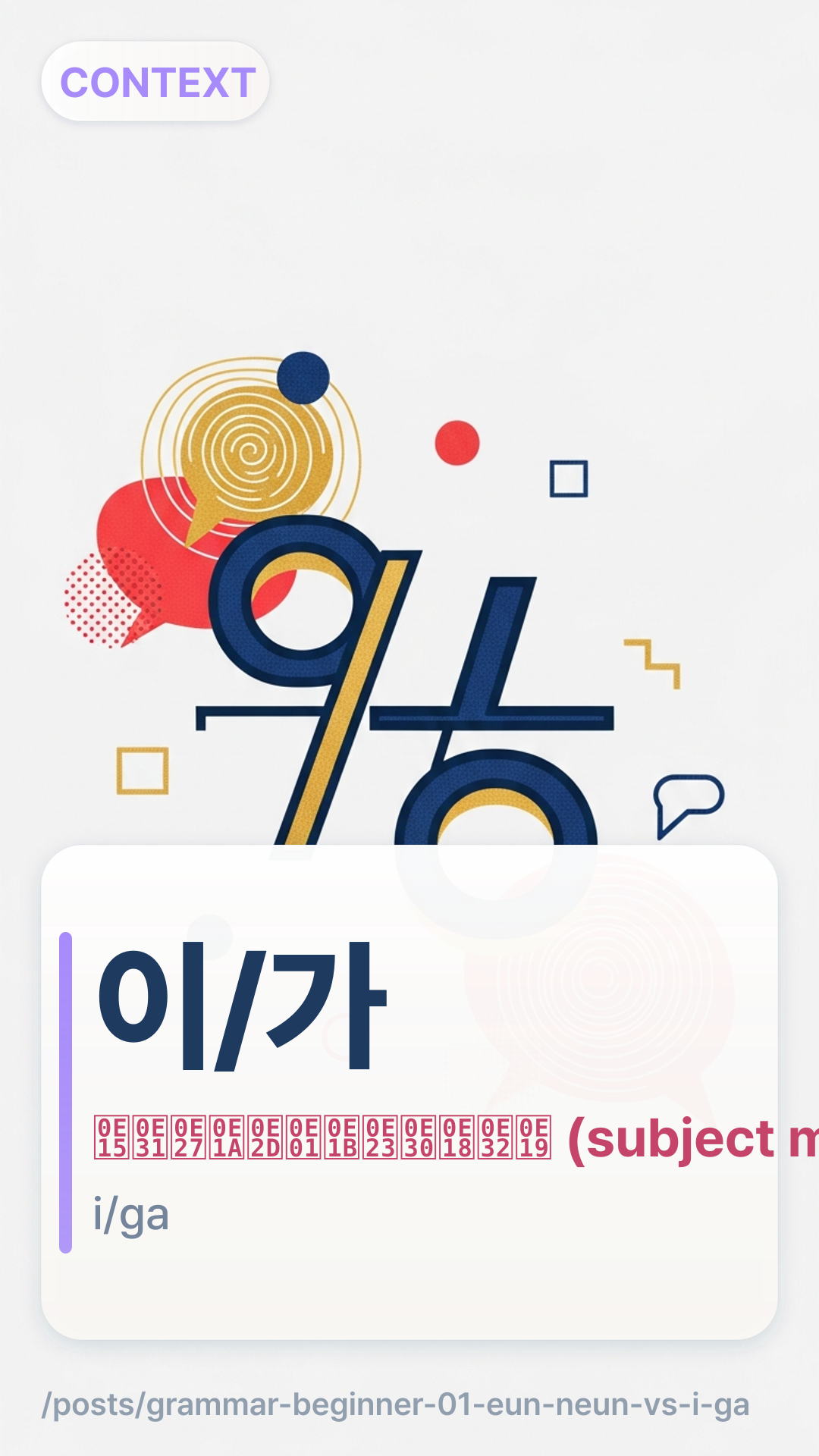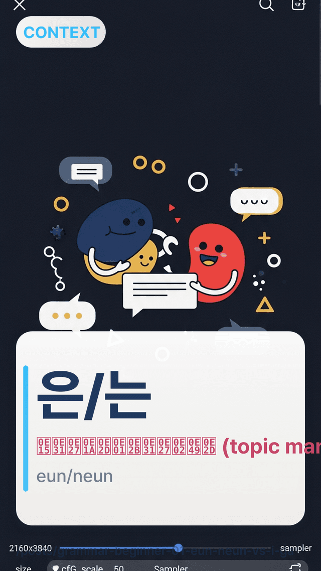 `은/는` ทำเครื่องหมาย “หัวข้อ” ว่าประโยคของคุณกำลังพูดถึงอะไร เหมาะมากสำหรับการตั้งบริบทและการเปรียบเทียบ/ตัดกัน (A vs B) ระดับภาษา: สุภาพ/กลางๆ; ใช้ได้ปลอดภัยทั้งในชีวิตประจำวันและที่ทำงาน