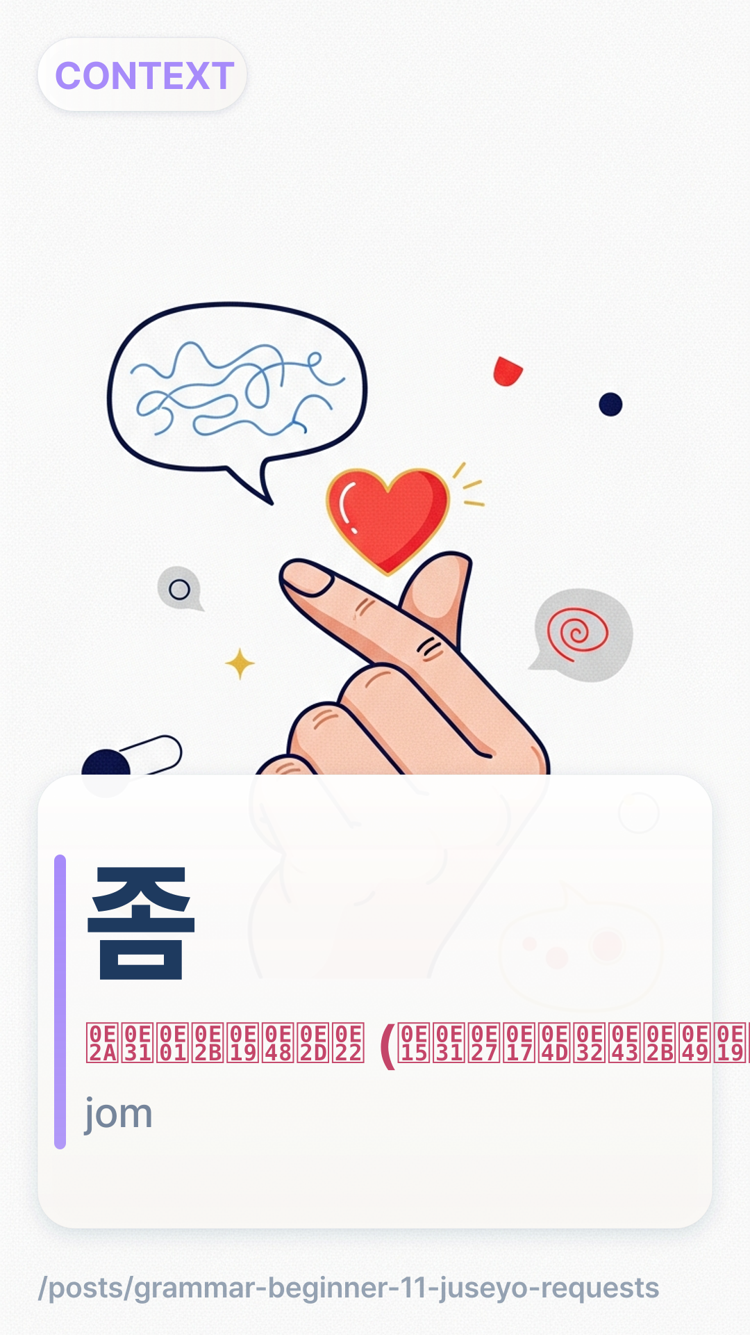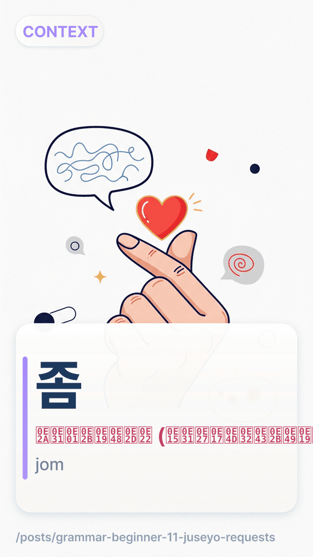 좀!jom! — ฟังเหมือนกำลังดุ/ตะคอก (“เฮ้ย!”)좀 해.jom hae. (พูดกับรุ่นพี่/หัวหน้า) — อาจฟังหยาบ เพราะลงท้ายแบบกันเอง; ควรต่อท้ายด้วยคำสุภาพอย่าง주세요juseyo그거 좀.geugeo jom. (ปล่อยค้างไว้) — คลุมเครือเกินไป; บอกให้ชัดว่าอยากให้เขาทำอะไร