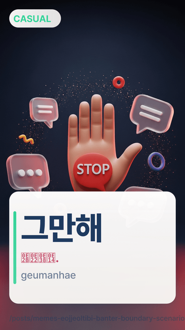 그만해geumanhae คือป้ายหยุด สั้น ชัด และดีเวลาคุณไม่อยากถกเถียง ถ้าอยากนุ่มลง เติม 줘jwo หรือใช้ 그만하자geumanhaja