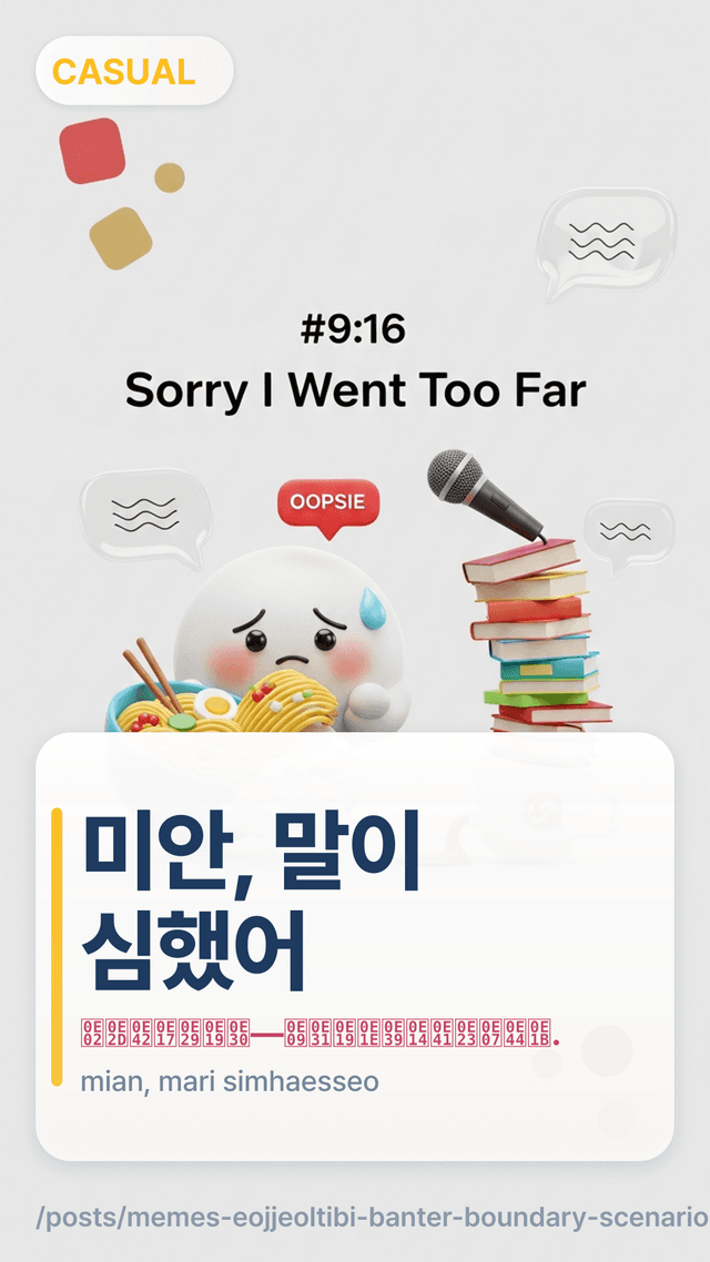 ประโยคซ่อมนี้ยอมรับว่าคุณพูดเกินไปโดยไม่อธิบายยืดยาว ใช้ได้ดีทันทีหลังเจอขอบเขตอย่าง 그만해geumanhae หรือ 선 넘네seon neomne จุดพลาดคือรีบใส่ข้อแก้ตัว; เริ่มด้วยสั้นๆ ก่อน