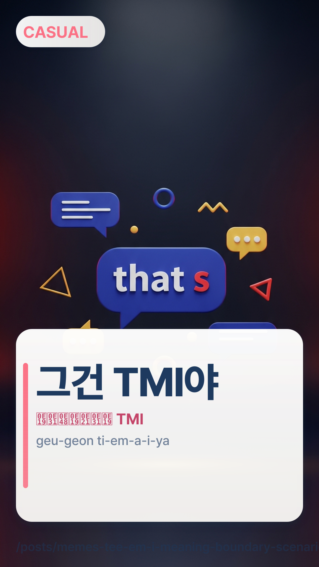 TMI เป็นมีมแชตในเกาหลีที่ยืมมาจากอังกฤษ “Too Much Information” ในเกาหลีมักใช้แบบเบาๆ คล้าย “รายละเอียดเสริมที่สนุกๆ” แต่ก็อาจหมายถึง “ส่วนตัวเกินไป/ไม่จำเป็น” ได้ด้วย กับดักที่พบบ่อยคือผู้เรียนคิดว่ามันหยาบเสมอ ซึ่งจริงๆ แล้วขึ้นอยู่กับน้ำเสียงและความสัมพันธ์