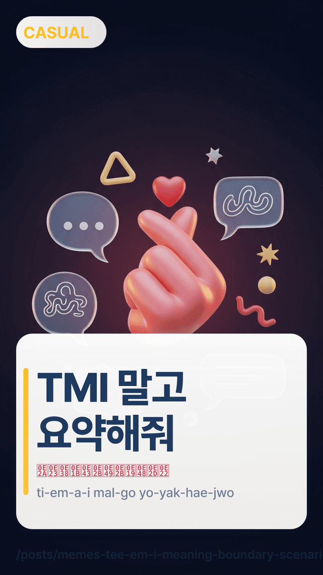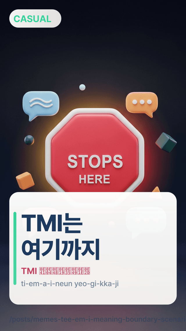 เรียนรู้ความหมายของ TMI (티엠아이) พร้อมประโยคตอบกลับง่ายๆ อย่าง “TMI인데” และ “그건 TMI야” เพื่อเบี่ยงประเด็นอย่างสุภาพโดยไม่ทำให้อีกฝ่ายเสียหน้า—ค้นพบ