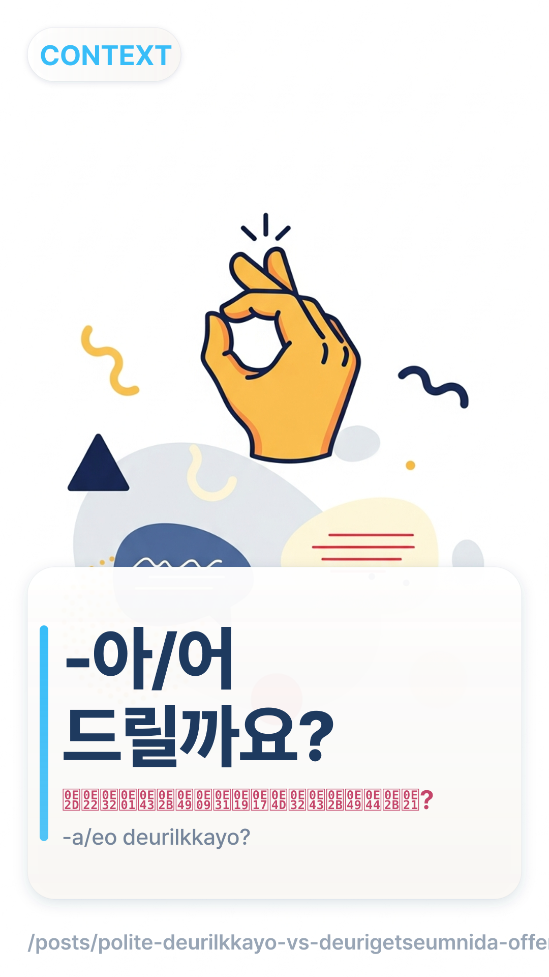 เรียนรู้ว่าเมื่อไหร่ควรใช้ 드릴까요? vs 드리겠습니다 ในการเสนอความช่วยเหลือแบบสุภาพ หลีกเลี่ยงการรับปากเกินไป และฟังเป็นธรรมชาติในการคุยเรื่องงาน—เข้าใจให้ชัดวันนี้