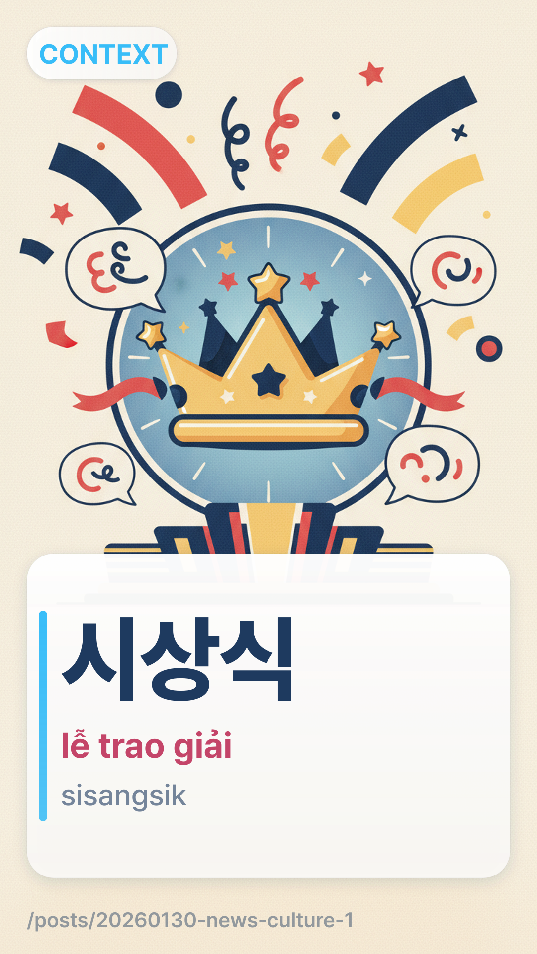 시상식sisangsik (sisangsik) dùng để chỉ một lễ trao giải hoặc một sự kiện trao giải thưởng. Đây là một từ ghép trong đó '시상' có nghĩa là trao giải và '식' có nghĩa là một buổi lễ hoặc sự kiện trang trọng.