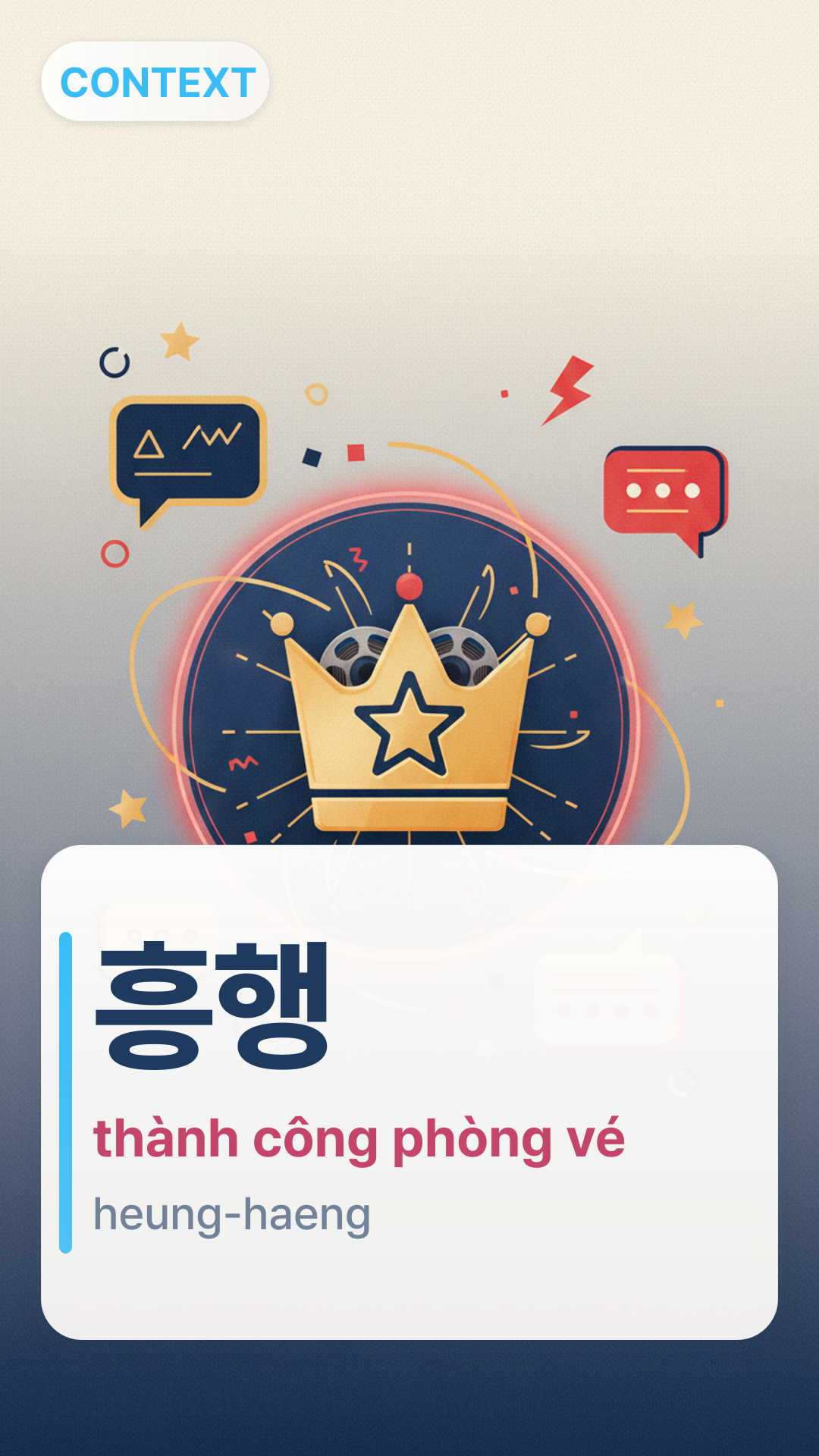 Trong bối cảnh phim ảnh và giải trí, '흥행' (heung-haeng) dùng để chỉ sự thành công về mặt thương mại hoặc 'hiệu suất phòng vé' của một buổi biểu diễn, vở kịch hoặc bộ phim. Mặc dù một bộ phim có thể là một kiệt tác nghệ thuật, nó chỉ được coi là một '흥행작' (một tác phẩm ăn khách) nếu nó kiếm được tiền.