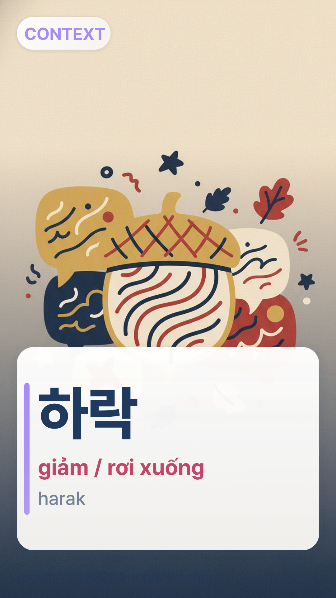 Trong khi 감소gamso có nghĩa là giảm về số lượng, 하락harak đặc biệt đề cập đến sự sụt giảm về giá trị, giá cả hoặc vị thế. Nó là từ trái nghĩa của 상승sangseung (tăng lên), nhưng trong các tiêu đề, nó thường cạnh tranh với 인상insang khi thảo luận về sự biến động của thị trường. Nếu một biểu đồ trong câu hỏi TOPIK cho thấy một đường đi xuống, 하락harak là từ bạn đang tìm kiếm.