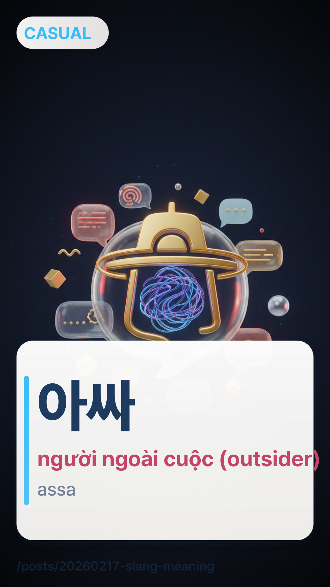 아싸assa là phiên bản rút gọn của từ tiếng Anh "Outsider" (아웃사이더). Nó ám chỉ một người không hòa nhập, thích ở một mình hoặc vụng về trong giao tiếp xã hội. Mặc dù trước đây nó mang nghĩa hơi tiêu cực, nhưng hiện nay nhiều người sử dụng nó một cách tự giễu để mô tả lối sống hướng nội của họ.