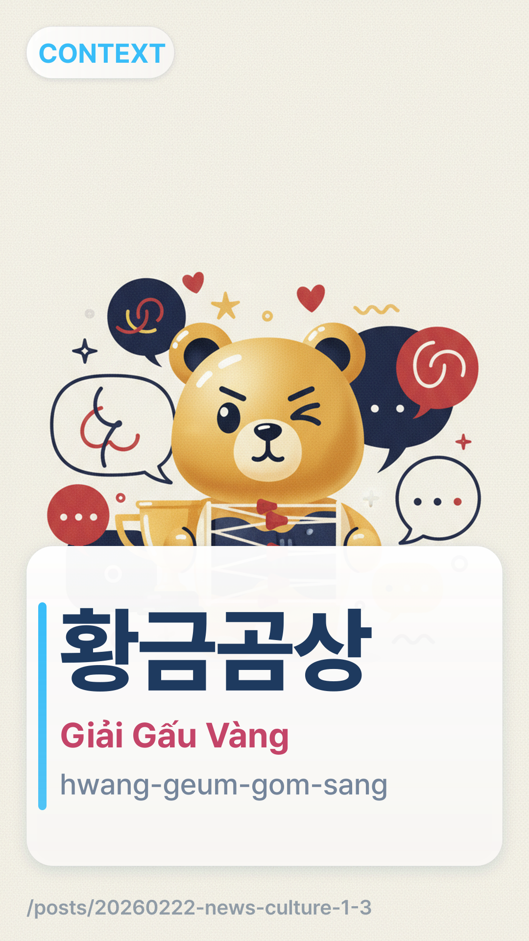 황금곰상hwanggeumgomsang (Hwang-geum-gom-sang) dùng để chỉ "Gấu Vàng", danh hiệu cao nhất tại Liên hoan phim quốc tế Berlin. Con gấu là biểu tượng của Berlin, xuất hiện trên huy hiệu của thành phố, đó là lý do tại sao chiếc cúp có hình dạng một con gấu.