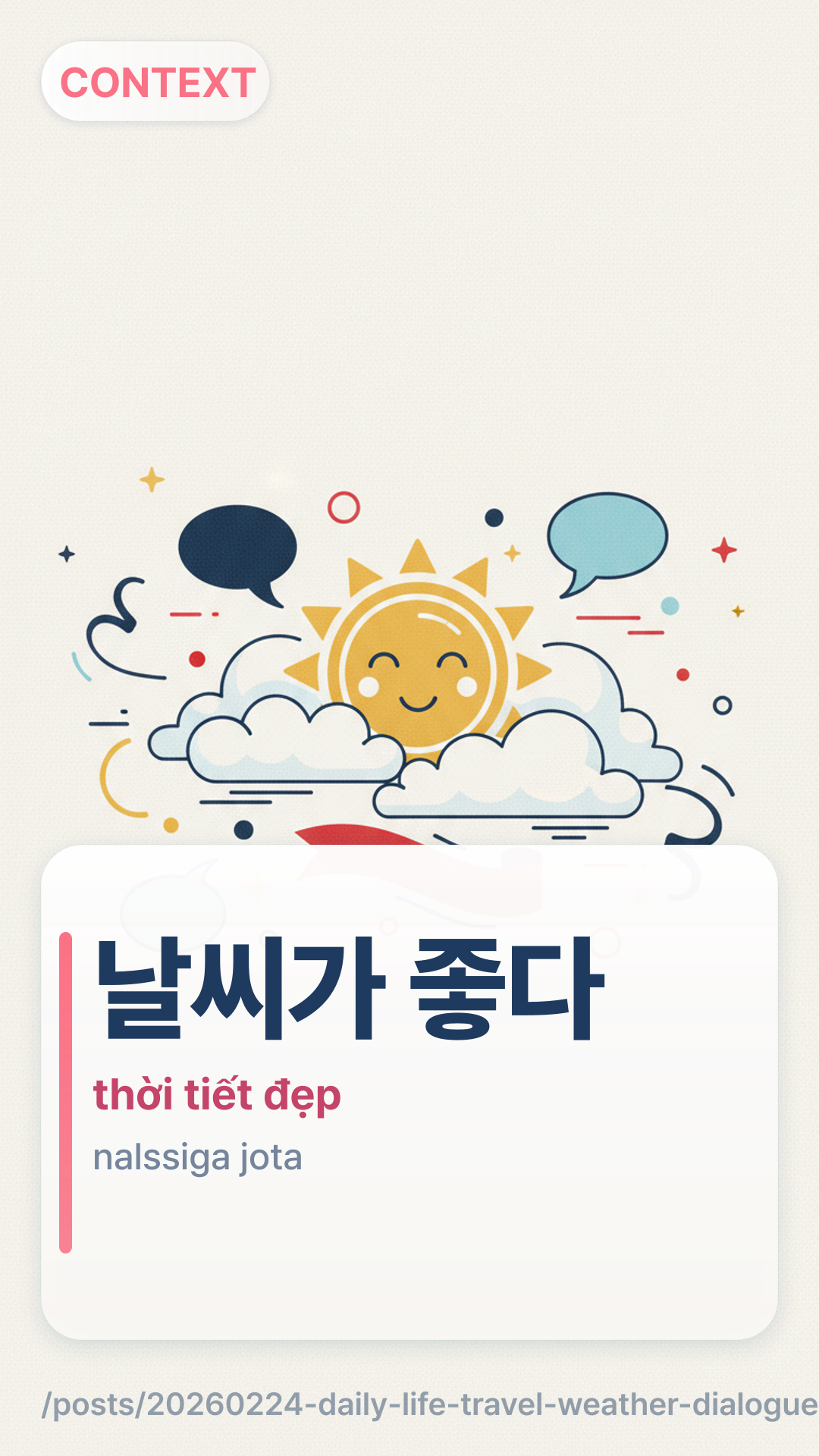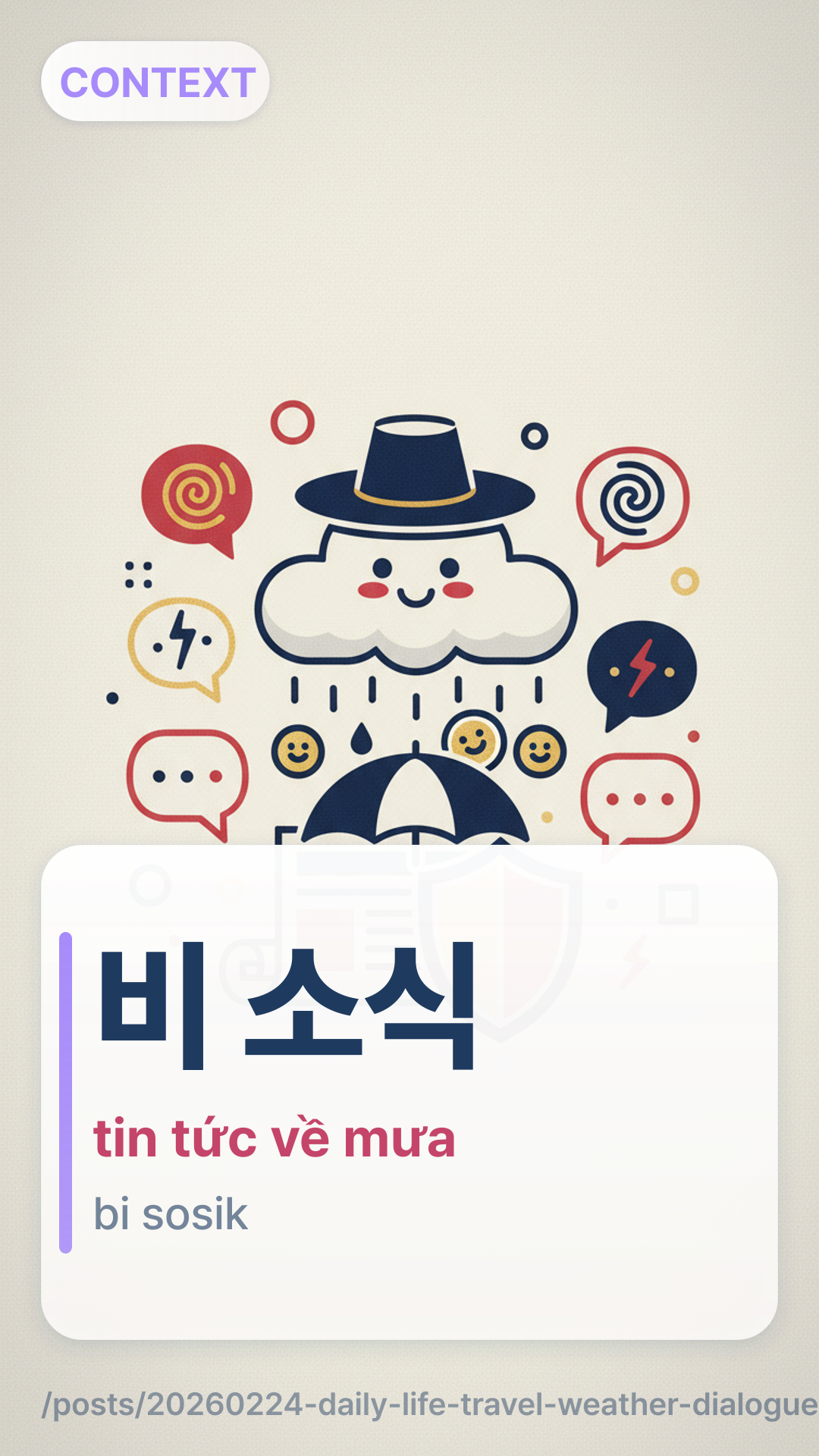 Khi lên kế hoạch du lịch, bạn không chỉ nhìn lên bầu trời; bạn kiểm tra 일기예보ilgiyebo chính thức. Đây là thuật ngữ tiêu chuẩn được sử dụng trong tin tức và các ứng dụng.