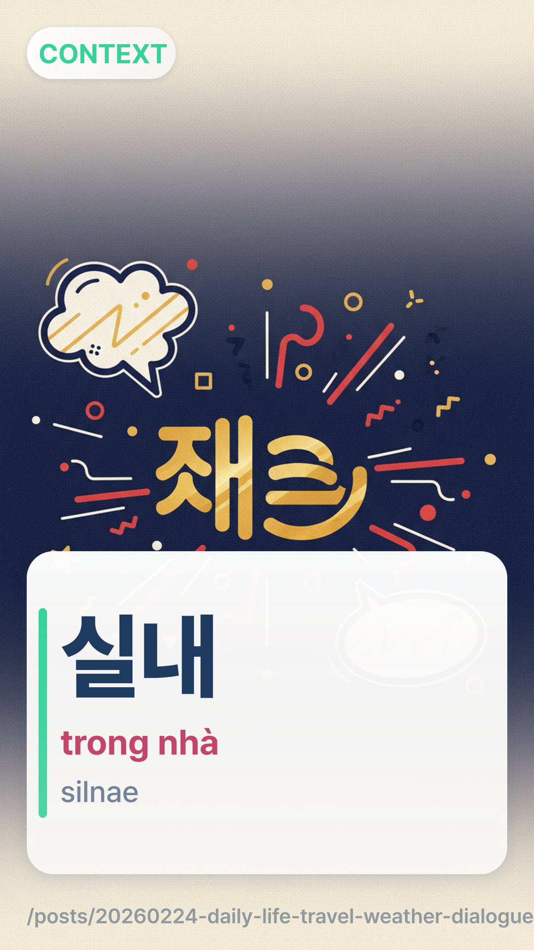실내silnae).일기예보ilgiyebo để biết liệu trời có tuyết hay không.기온gion đề cập đến việc nhiệt độ thấp, cần phải mặc quần áo dày.Kiểm tra ứng dụng thời tiết của bạn bằng tiếng Hàn! Tìm các từ 강수확률gangsuhwakryul (xác suất kết tủa/mưa) và 최고기온choegogion (nhiệt độ cao nhất) để thực hành từ vựng du lịch của bạn trong thực tế.