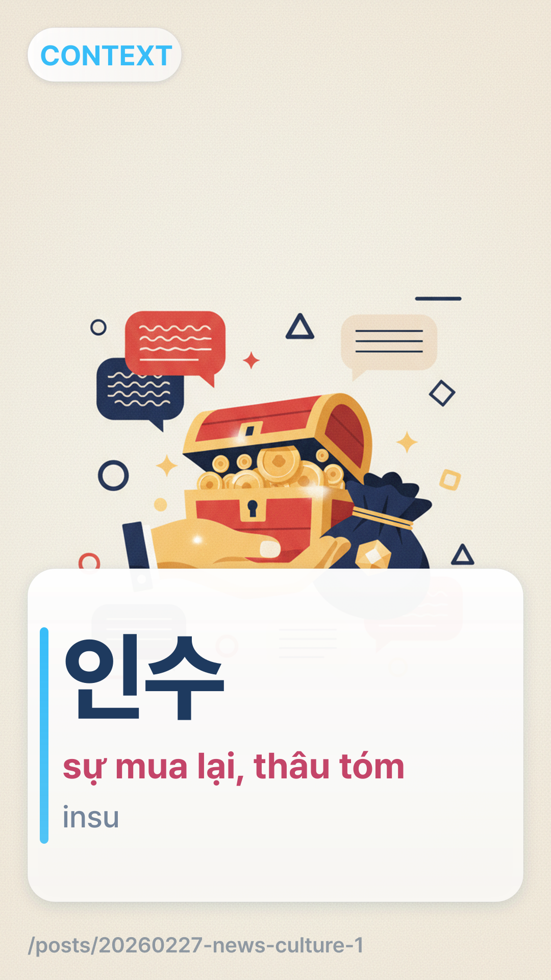 Trong bối cảnh tin tức này, 인수insu (insu) đề cập đến việc mua lại hoặc tiếp quản một công ty. Nó thường được ghép với 합병hapbyeong (hapbyeong - sáp nhập) để tạo thành thuật ngữ M&A (인수합병).