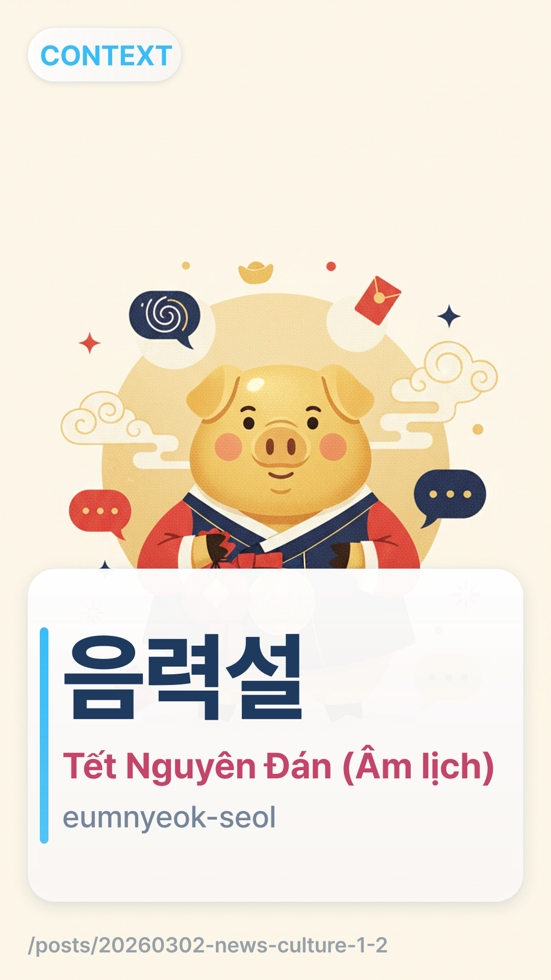 음력설eumryeokseol (Eumnyeok-seol) dùng để chỉ năm mới dựa trên âm lịch. Trong bối cảnh của bài báo, đây là thuật ngữ được sử dụng để dịch "Lunar New Year" và đại diện cho ý tưởng rằng ngày lễ này thuộc về toàn bộ Đông Á, không chỉ một quốc gia.