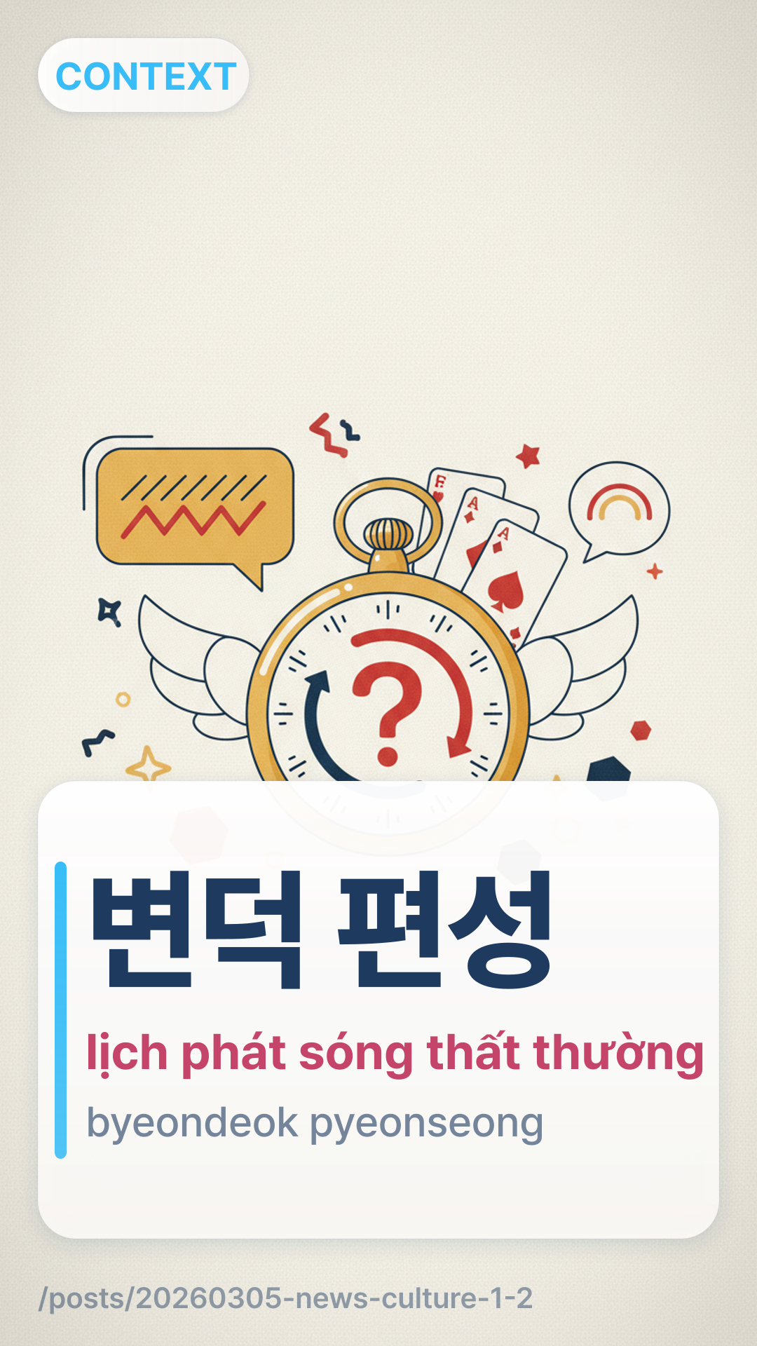 변덕 편성byeondeok pyeonseong (Byeondeok Pyeonseong) đề cập đến việc một đài truyền hình thường xuyên thay đổi giờ phát sóng hoặc hủy bỏ một chương trình đã lên lịch mà không thông báo trước nhiều. Nó bắt nguồn từ 변덕byeondeok (sự thất thường/thay đổi nhanh chóng) và 편성pyeonseong (lập chương trình/sắp xếp lịch trình).
