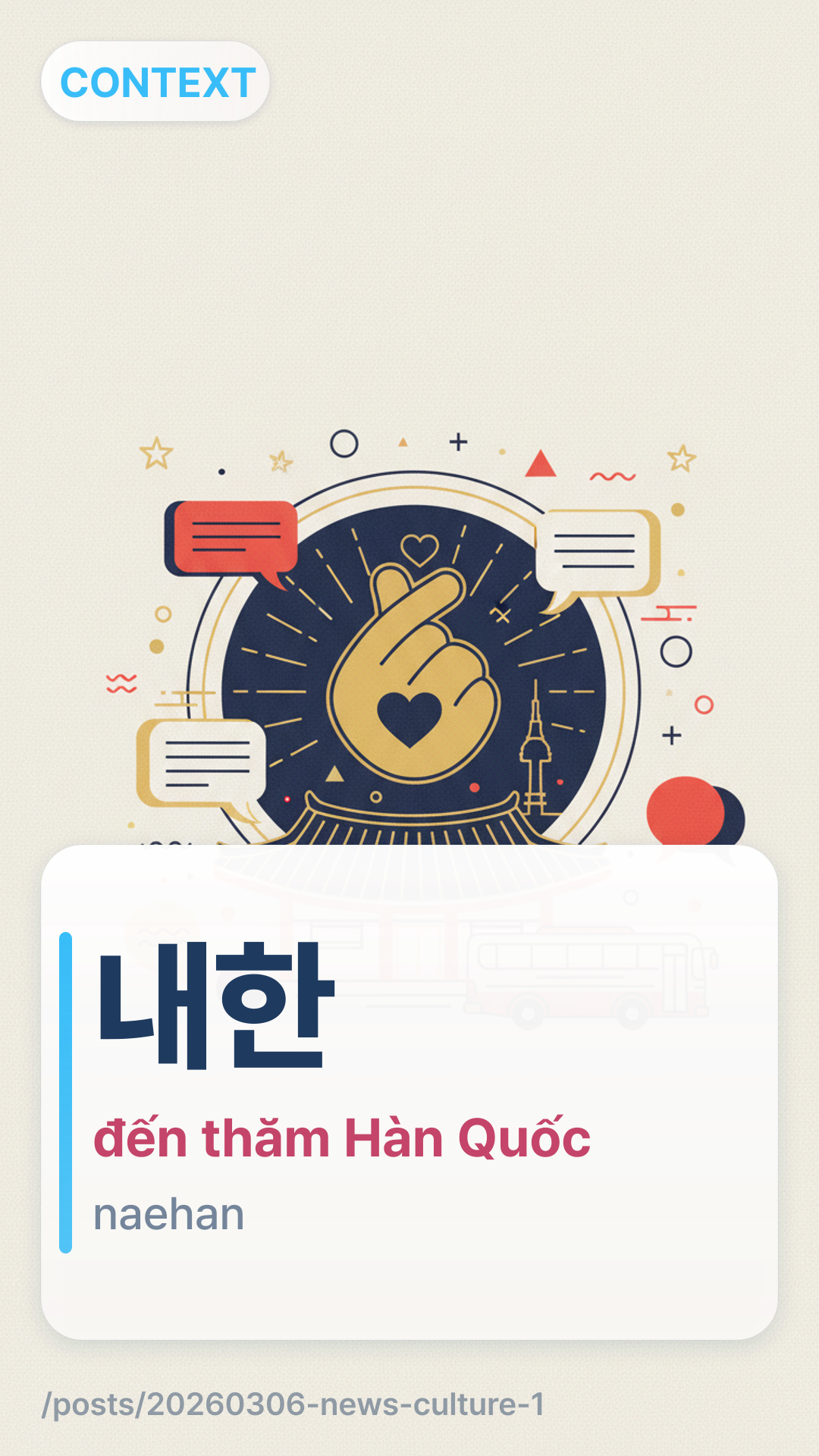 내한naehan (nae-han) đề cập đến một người nổi tiếng hoặc nhân vật công chúng sống ở nước ngoài đến thăm Hàn Quốc. Nó là sự kết hợp của '내' (đến/bên trong) và '한' (Hàn Quốc). Bạn sẽ thấy từ này liên tục trong các tiêu đề tin tức khi các ngôi sao Hollywood hoặc các nhạc sĩ quốc tế đến để quảng bá.