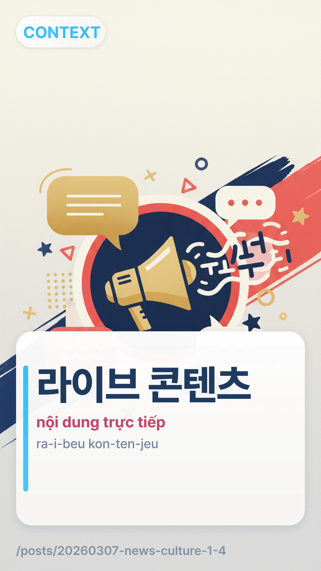 라이브 콘텐츠raibeu kontencheu (Nội dung trực tiếp) đề cập đến các phương tiện truyền thông được phát sóng theo thời gian thực qua internet, chẳng hạn như các trận đấu thể thao, buổi hòa nhạc hoặc chương trình trò chuyện, thay vì được ghi hình trước và chỉnh sửa để xem sau.