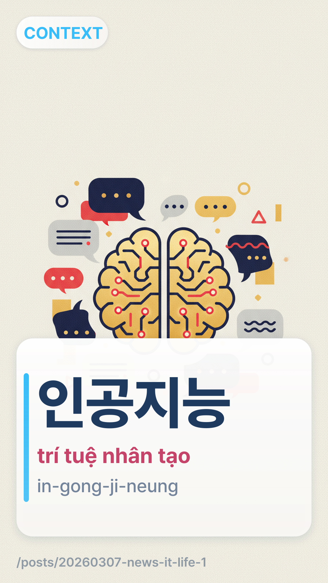 인공지능ingongjineung (In-gong-ji-neung) có nghĩa là Trí tuệ nhân tạo (AI). Trong tin tức và hội thoại hàng ngày tại Hàn Quốc, nó thường được viết tắt là AI. Từ này kết hợp giữa 인공ingong (nhân tạo) và 지능jineung (trí tuệ).