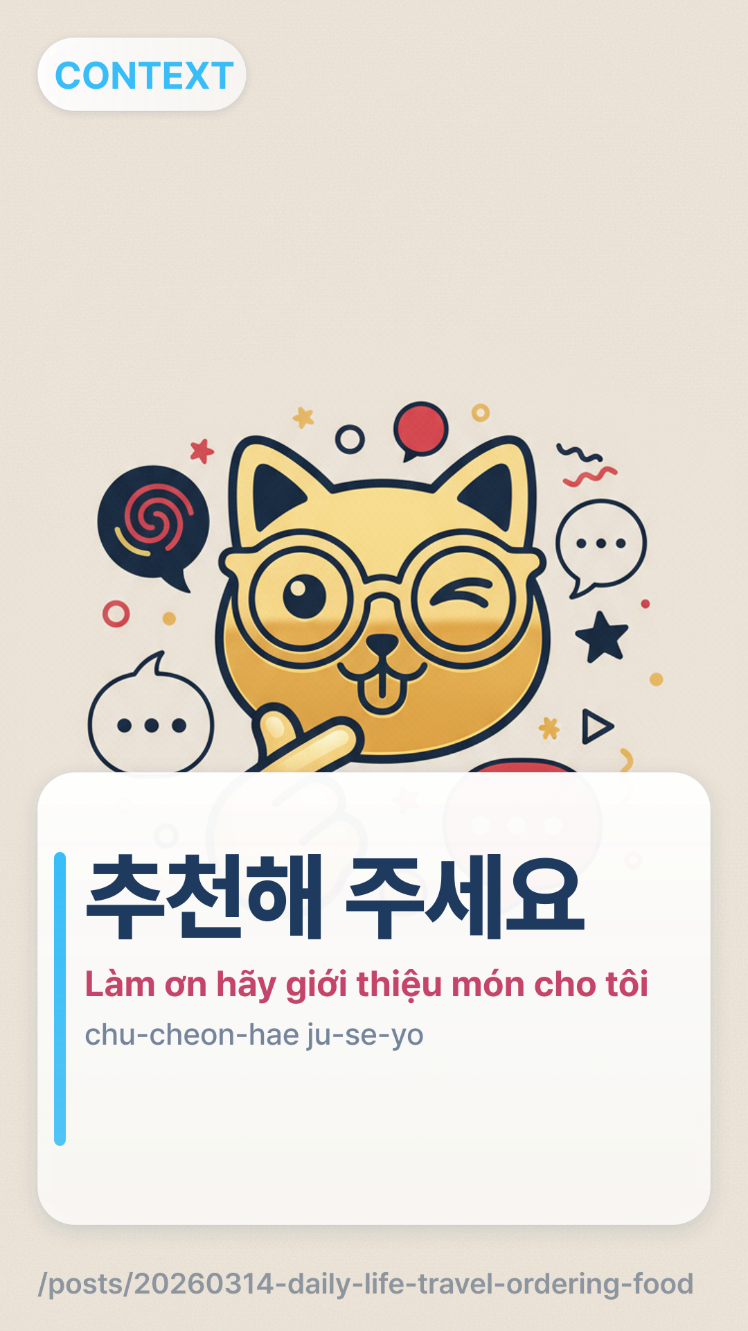 Khi bạn bị choáng ngợp bởi một thực đơn toàn chữ Hangul, việc yêu cầu gợi ý là cách nhanh nhất để tìm ra món đặc sản của quán. Nó cũng cho thấy bạn tin tưởng vào sự am hiểu của nhân viên.