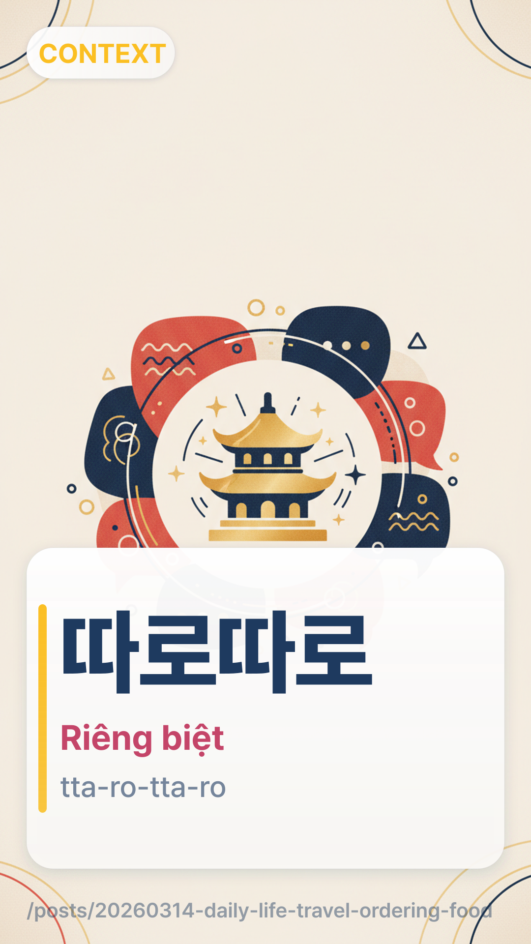 따로따로 계산할 수 있나요?ttarottaro gyesanhal su itnayo? — Chúng tôi có thể thanh toán riêng được không?