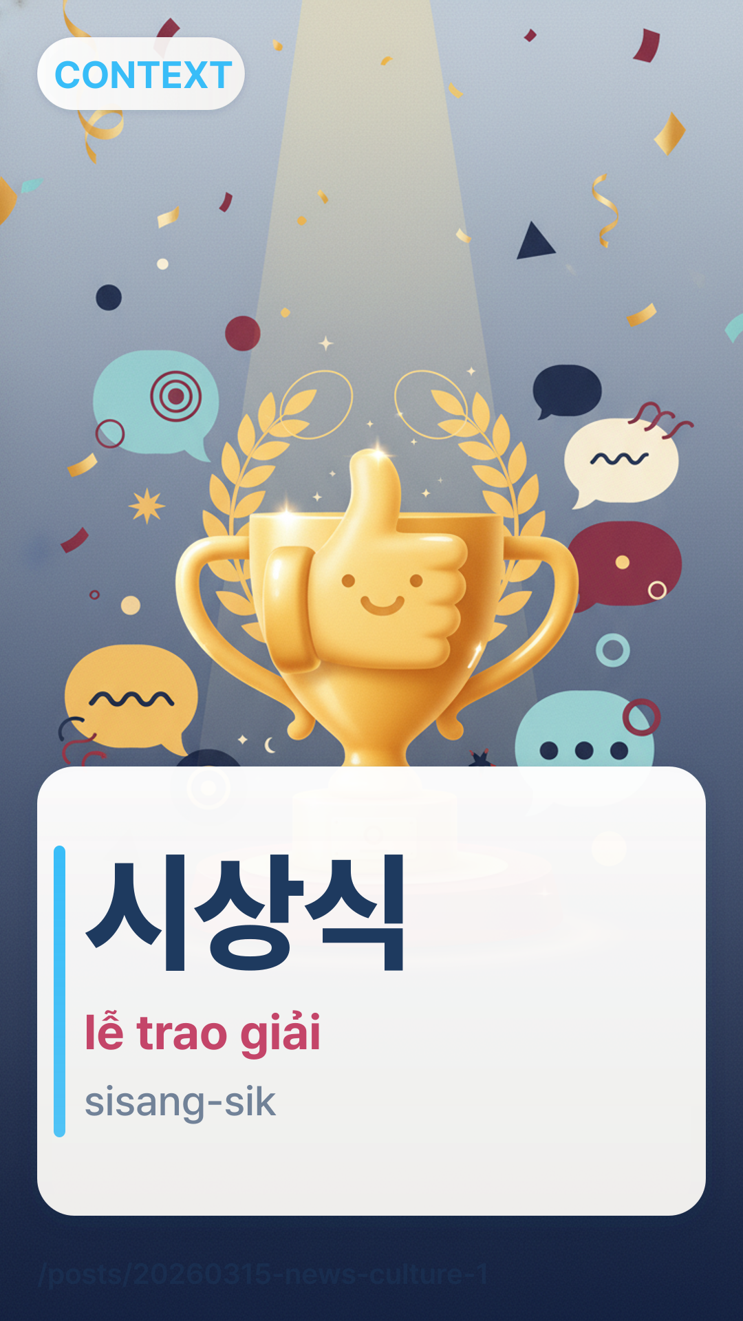 Khi bạn thấy hậu tố -식-sik trong tiếng Hàn, nó thường biểu thị một buổi lễ hoặc một phương thức chính thức (như 결혼식gyeolhonsik cho đám cưới). Hãy chú ý đến những từ này trong mùa trao giải sắp tới tại Hàn Quốc để xem các ngôi sao khác nhau xử lý bài phát biểu nhận giải của họ như thế nào!