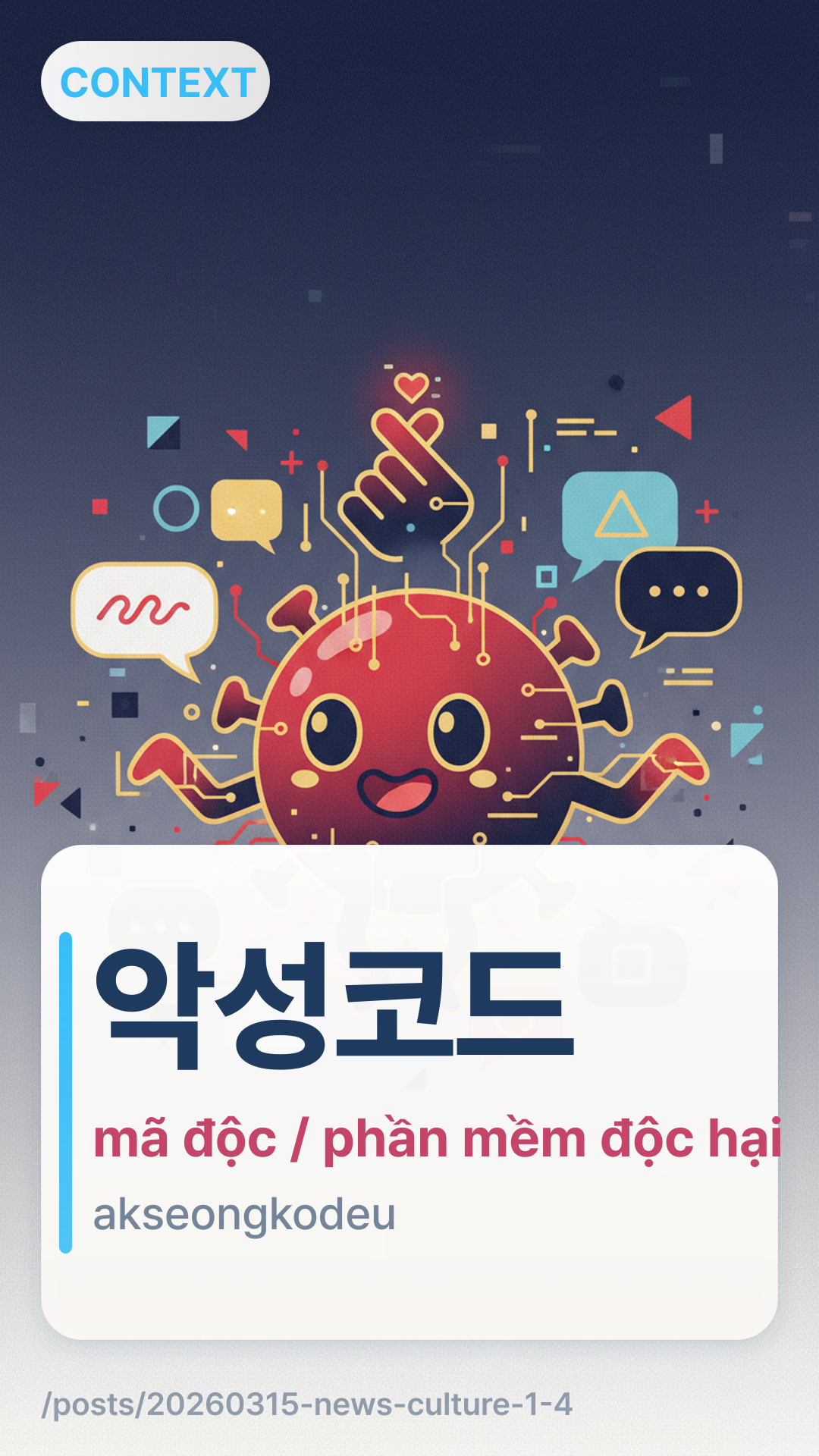 악성코드akseongkodeu (Ak-seong-ko-deu) đề cập đến 'Mã độc' hoặc 'Phần mềm độc hại'. Đây là một từ ghép của '악성' (tính chất ác tính/xấu xa) và từ mượn '코드' (mã/code). Trong tin tức Hàn Quốc, đây là thuật ngữ tiêu chuẩn cho bất kỳ phần mềm nào được thiết kế để gây hại hoặc truy cập trái phép vào hệ thống máy tính.