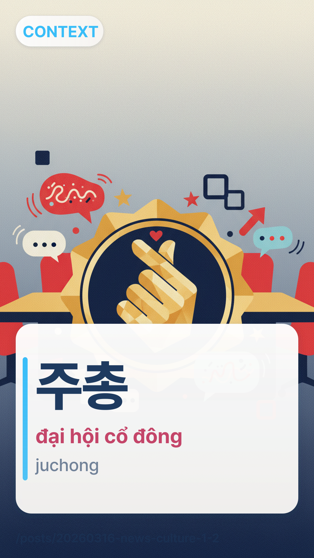 주총 시즌이라 경제 뉴스가 아주 많아요.juchong sijeunira gyeongje nyuseuga aju manhayo. — Vì đang là mùa đại hội cổ đông nên có rất nhiều tin tức kinh tế.