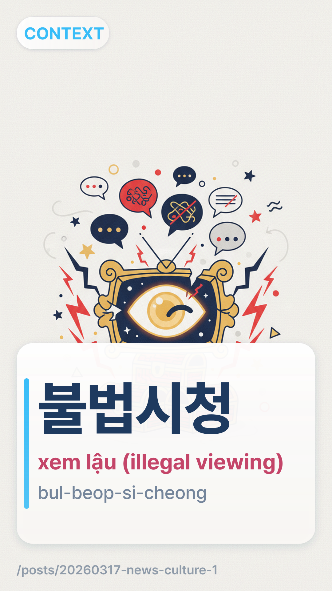불법시청bulbeopsicheong (bul-beop-si-cheong) có nghĩa là 'xem lậu' hoặc 'phát trực tuyến trái phép'. Nó kết hợp giữa '불법' (bất hợp pháp) và '시청' (xem). Thuật ngữ này thường xuyên được sử dụng trong các bản tin thảo luận về vi phạm bản quyền và xâm phạm quyền tác giả trong kỷ nguyên số.
