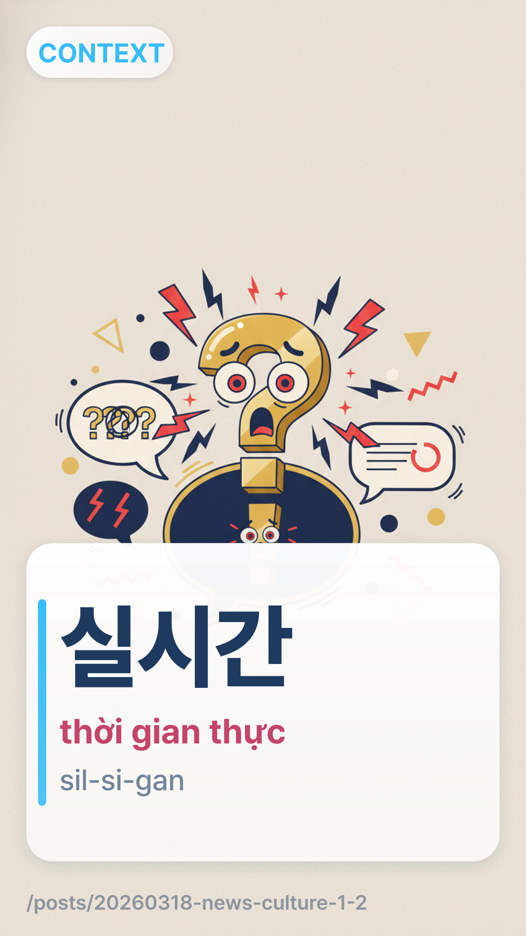 (sil-si-gan) có nghĩa là "thời gian thực" hoặc "trực tiếp". Trong bối cảnh tin tức và truyền thông, nó mô tả các sự kiện được phát sóng ngay khi chúng đang diễn ra, không có sự chậm trễ. Bạn sẽ thường thấy từ này trong cụm từ (phát trực tuyến thời gian thực) hoặc (bảng xếp hạng âm nhạc thời gian thực).
