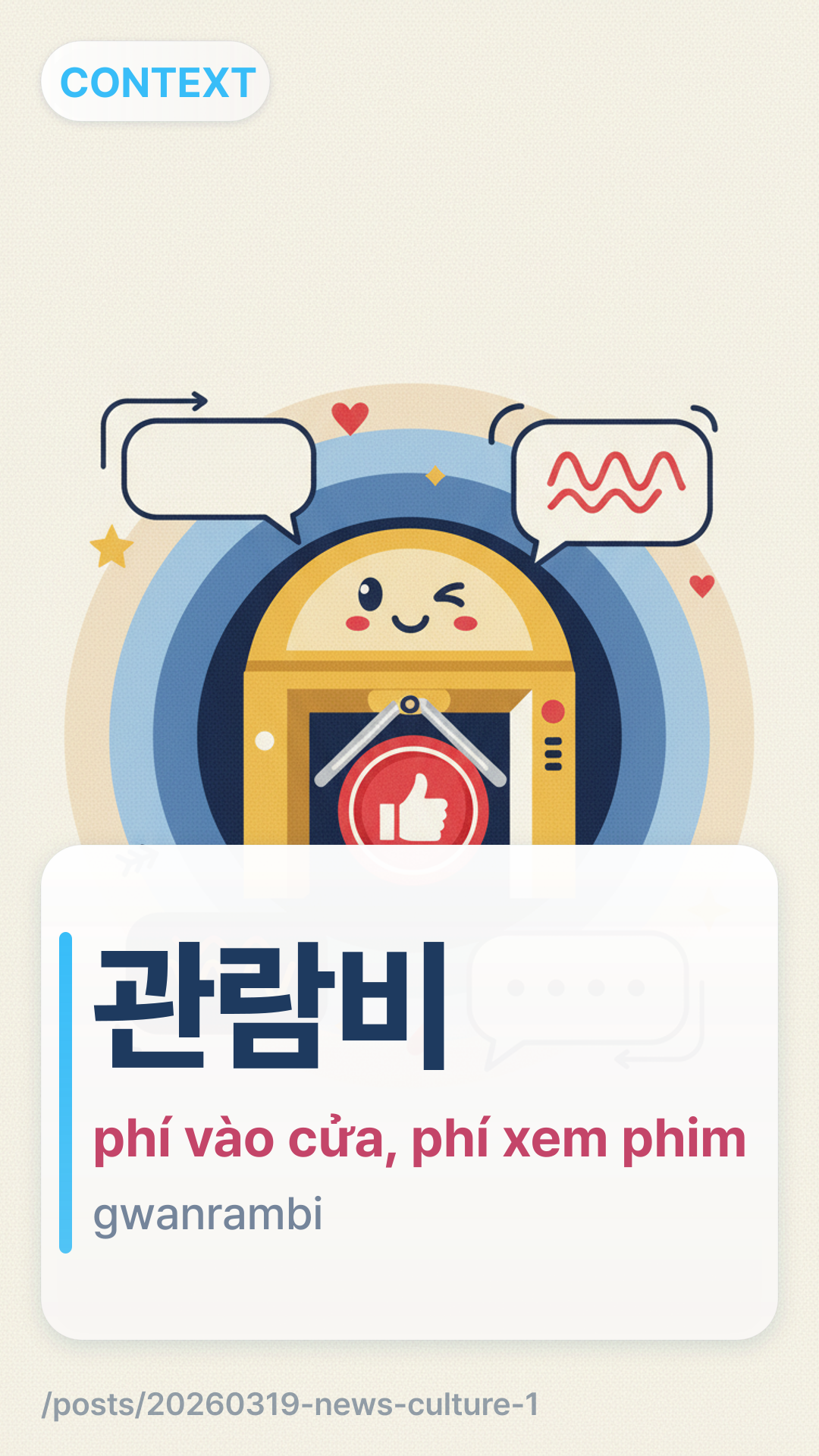 관람비gwanrambi (Gwan-ram-bi) dùng để chỉ phí vào cửa hoặc chi phí xem một buổi biểu diễn, bộ phim hoặc triển lãm. Nó là một từ ghép của 관람gwanram (xem/quan sát) và 비bi (phí/chi phí). Trong bối cảnh tin tức, nó đặc biệt nhấn mạnh vào chi phí vé xem phim đang tăng cao khiến công chúng e ngại.