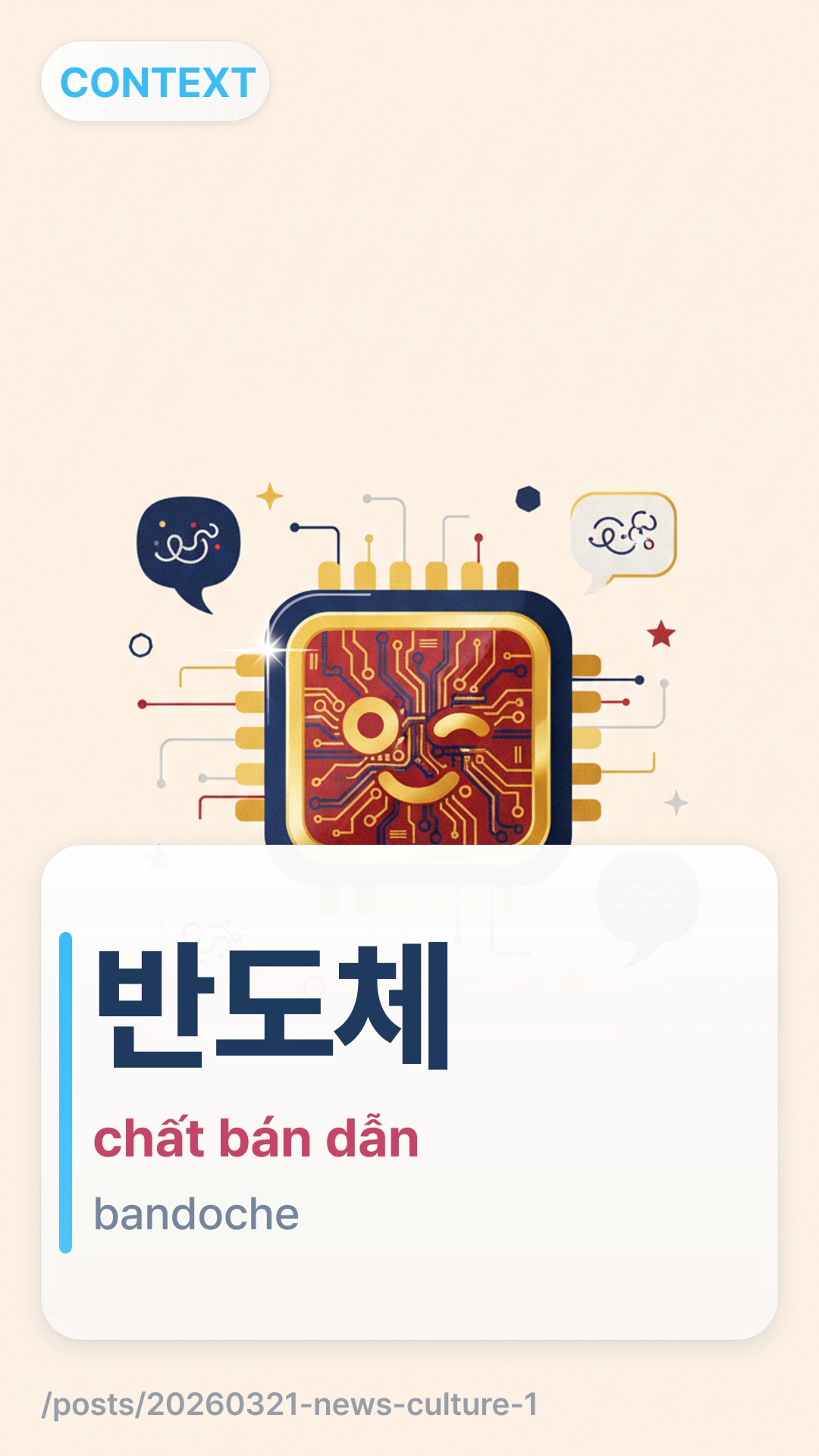 반도체bandoche (bandoche) dùng để chỉ chất bán dẫn (semiconductor). Trong bối cảnh tin tức Hàn Quốc, nó thường ám chỉ rộng rãi đến toàn bộ ngành công nghiệp chip, vốn là trụ cột của nền kinh tế Hàn Quốc.