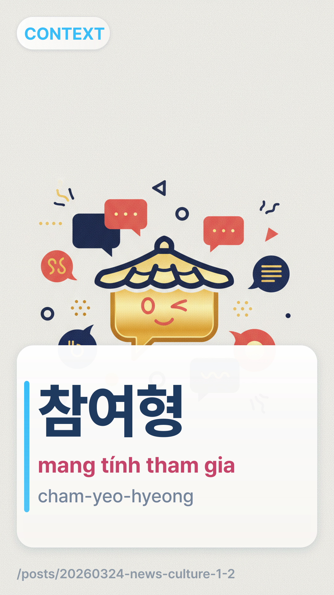 참여형chamyeohyeong (cham-yeo-hyeong) đề cập đến thứ gì đó mang tính 'tham gia' hoặc 'dựa trên sự tương tác'. Trong bối cảnh tin tức, nó mô tả một mô hình dịch vụ mà khán giả không chỉ là người xem mà còn là người tham gia tích cực vào quá trình này.