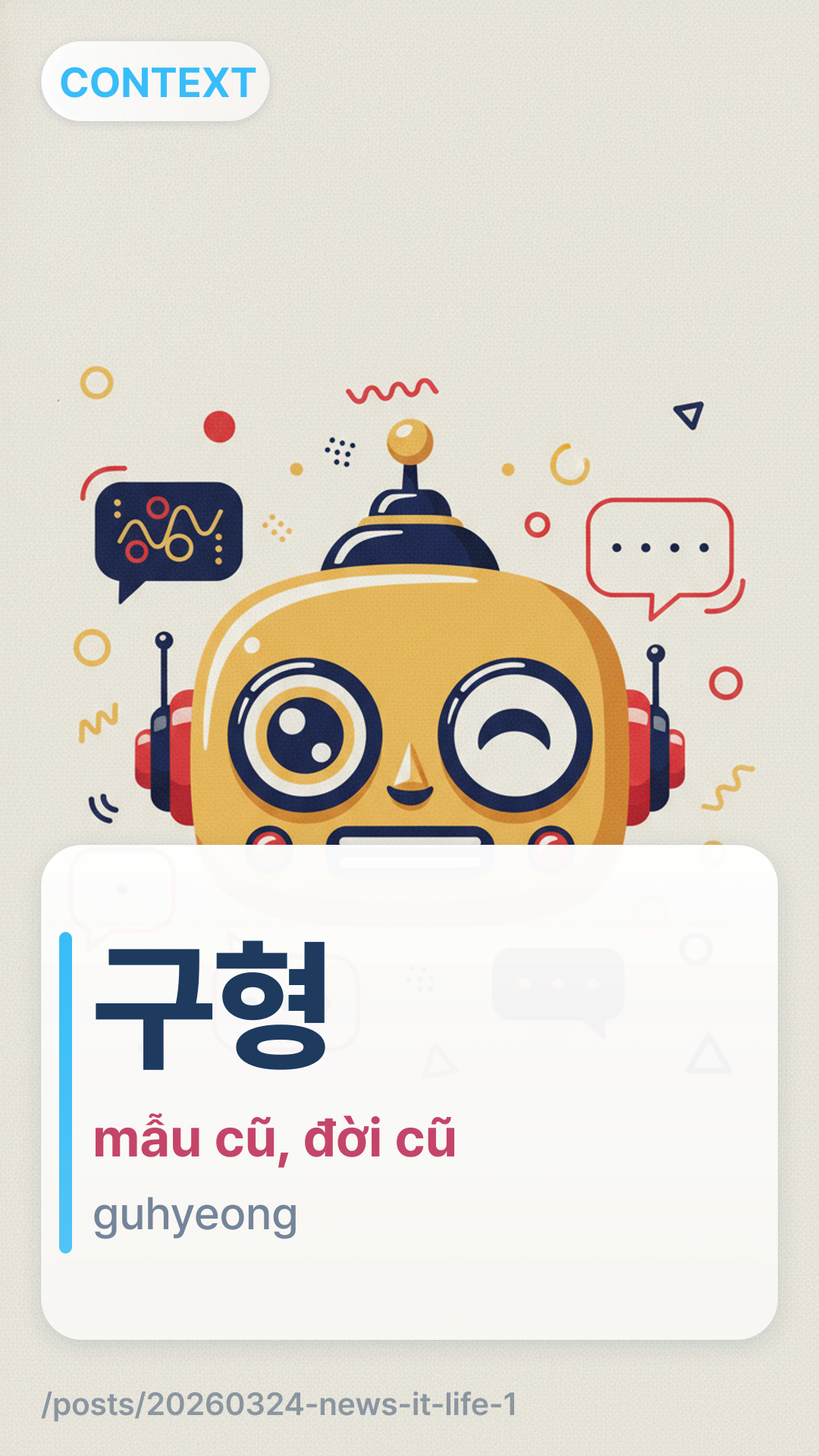 Trong bối cảnh tin tức công nghệ, 구형guhyeong (guhyeong) dùng để chỉ một mẫu cũ hoặc phiên bản lỗi thời của một sản phẩm, trái ngược với 신형sinhyeong (mẫu mới).