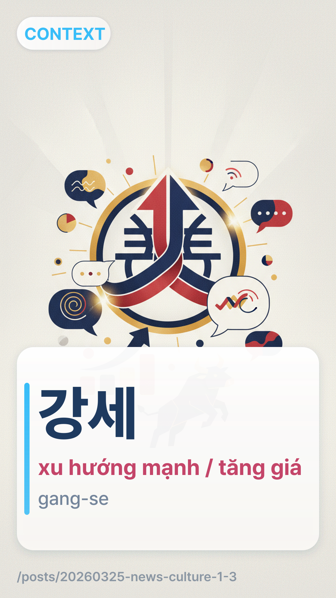 강세gangse (Gang-se) đề cập đến một "xu hướng mạnh" hoặc một "thị trường tăng giá" trong bối cảnh tài chính. Trong khi trong ngôn ngữ thông thường nó có thể có nghĩa là trọng âm mạnh hoặc sức mạnh thể chất, trong các tiêu đề tin tức, nó hầu như luôn chỉ ra rằng giá cổ phiếu hoặc giá trị tiền tệ đang tăng hoặc dự kiến sẽ tăng.