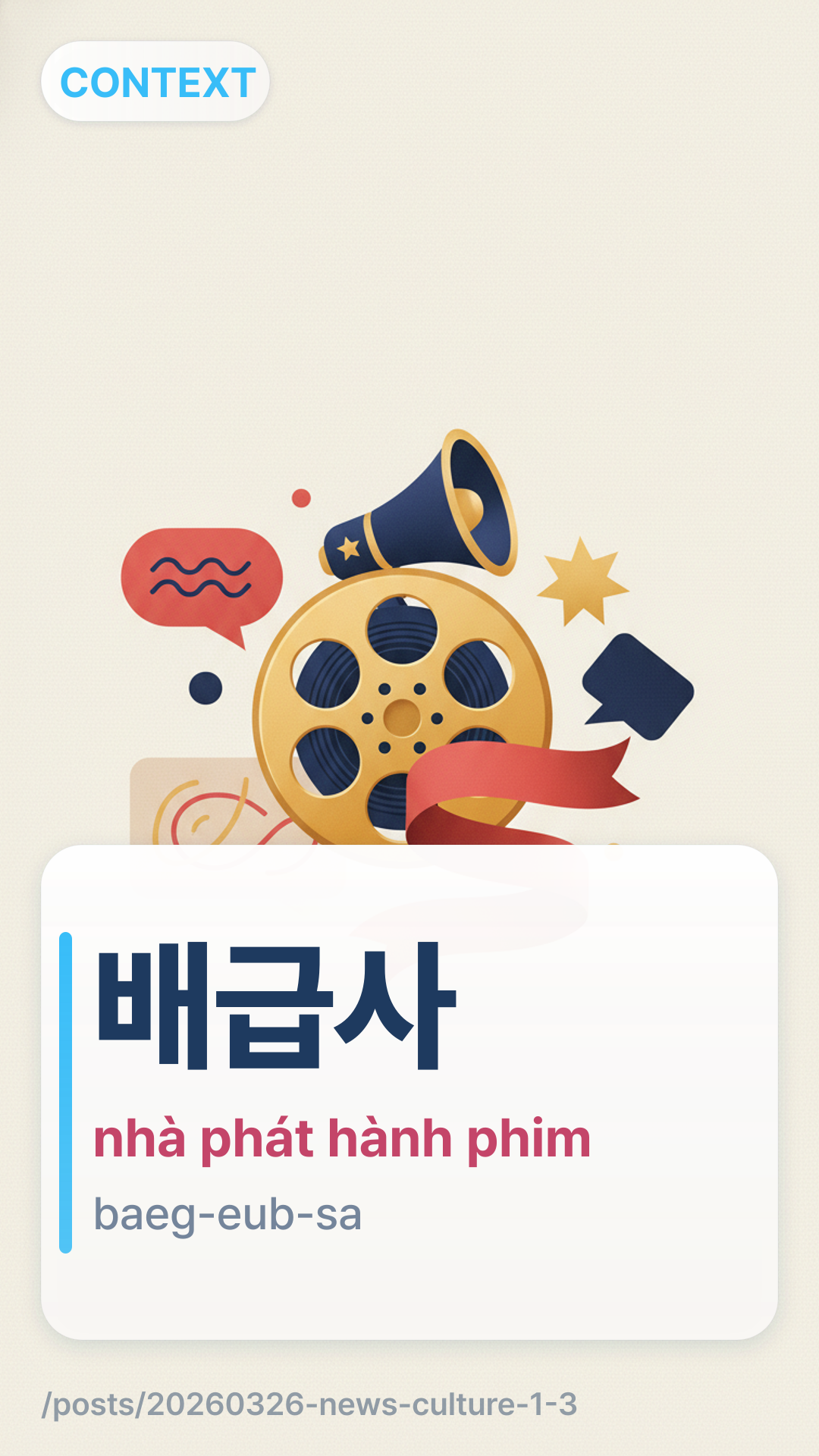 Trong bối cảnh ngành giải trí Hàn Quốc, 배급사baegeupsa (baeg-eub-sa) là nhà phát hành phim. Họ là bên trung gian giữa công ty sản xuất và rạp chiếu phim, xử lý việc tiếp thị, lập lịch trình và phân phối phim vật lý/kỹ thuật số đến các màn ảnh.