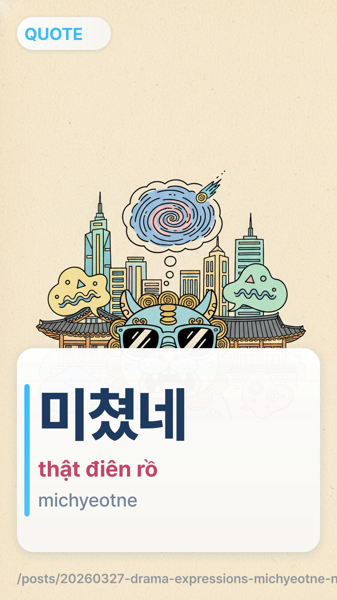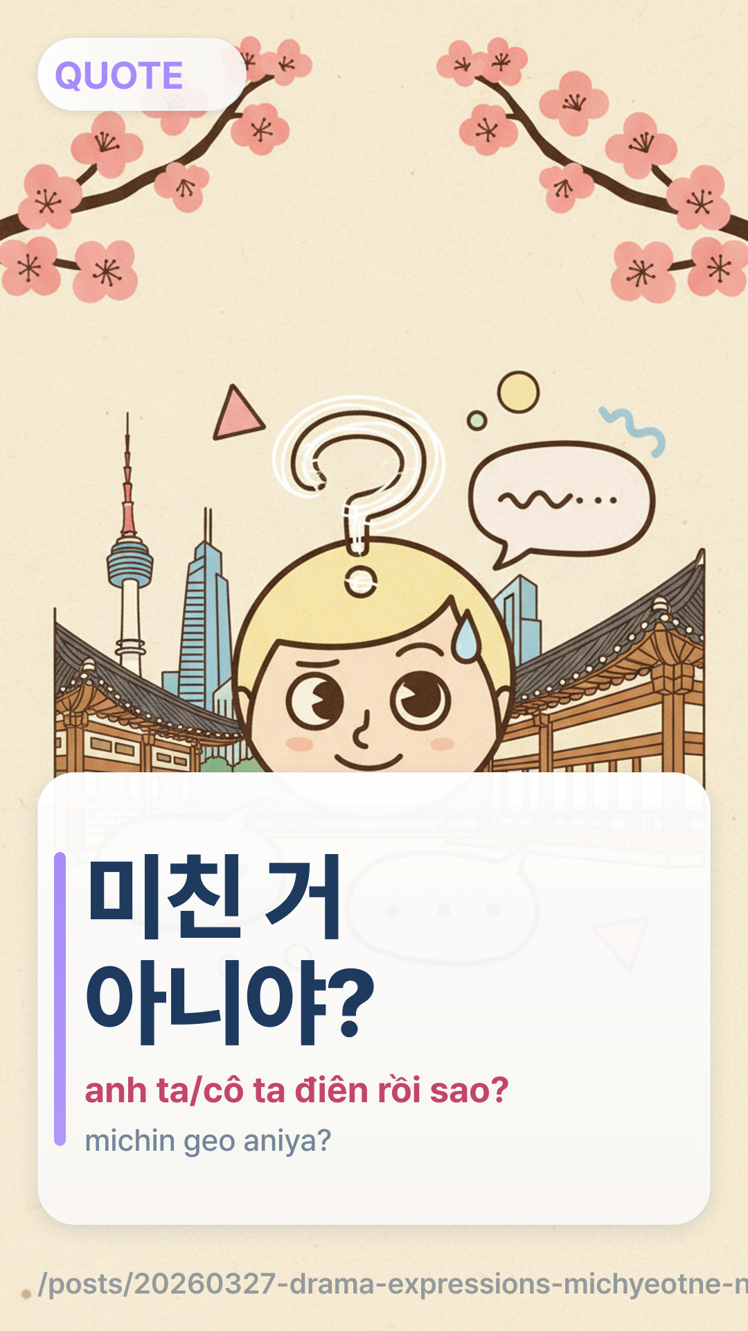 Bạn đang xem tập cuối của một bộ phim giật gân báo thù. Người thầy 'đáng tin cậy' của nhân vật chính vừa bước vào văn phòng của kẻ phản diện và bắt tay. Bạn thấy dòng chat trực tiếp trên Viki hoặc Weverse bùng nổ với một từ duy nhất: 미쳤네michyeotne. Đó là phản ứng phổ biến của người Hàn đối với bất cứ điều gì vượt qua giới hạn bình thường.