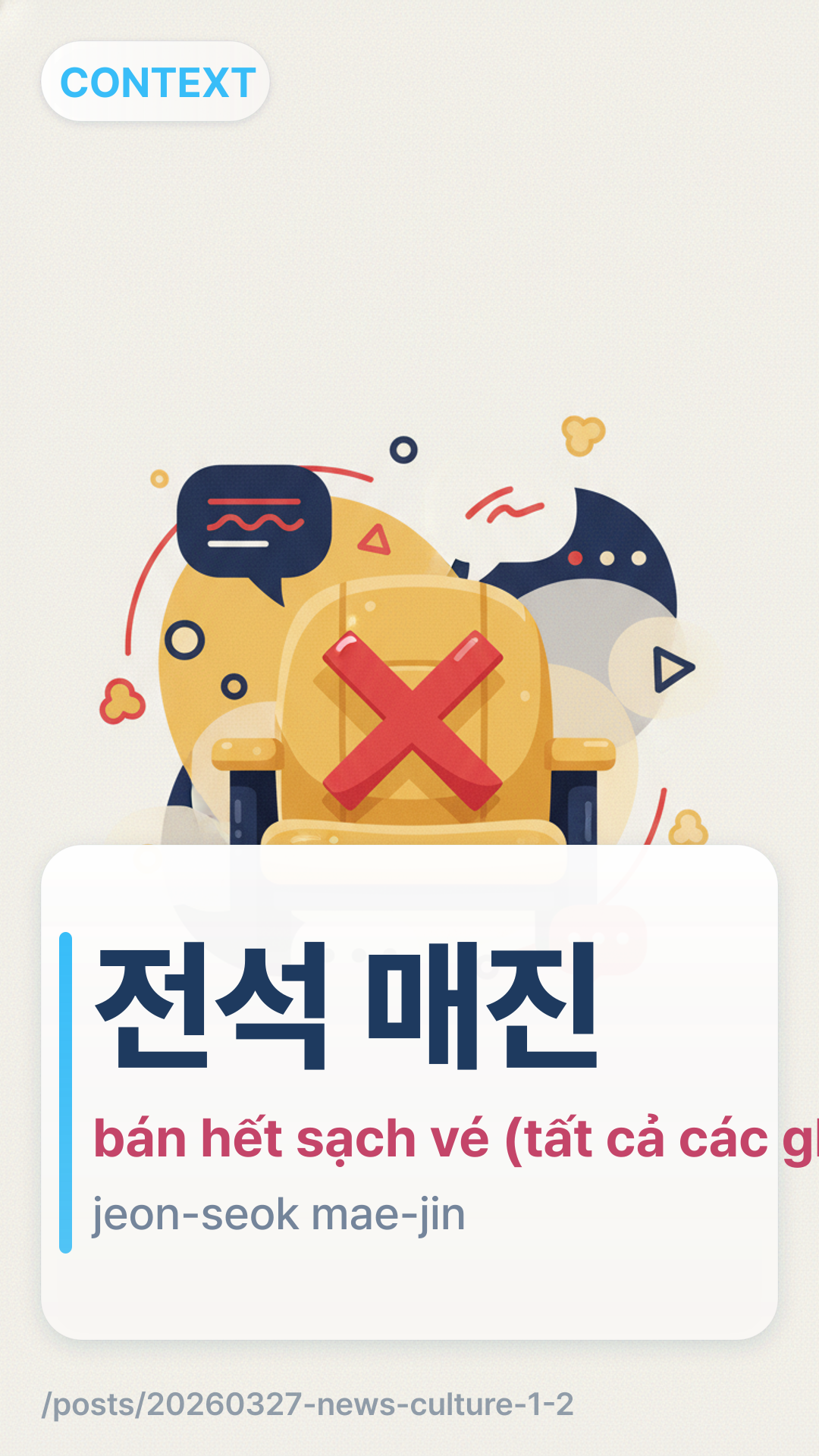 전석 매진jeonseok maejin (jeon-seok mae-jin) dùng để chỉ việc "bán hết sạch vé" của tất cả các ghế ngồi có sẵn tại một địa điểm. Đây là từ ghép của 전석jeonseok (tất cả các ghế) và 매진maejin (bán hết). Bạn sẽ thấy thuật ngữ này xuất hiện liên tục trong các tin tức giải trí Hàn Quốc liên quan đến các buổi hòa nhạc, nhạc kịch và fan meeting để chỉ sự thành công về mặt thương mại của một buổi biểu diễn.