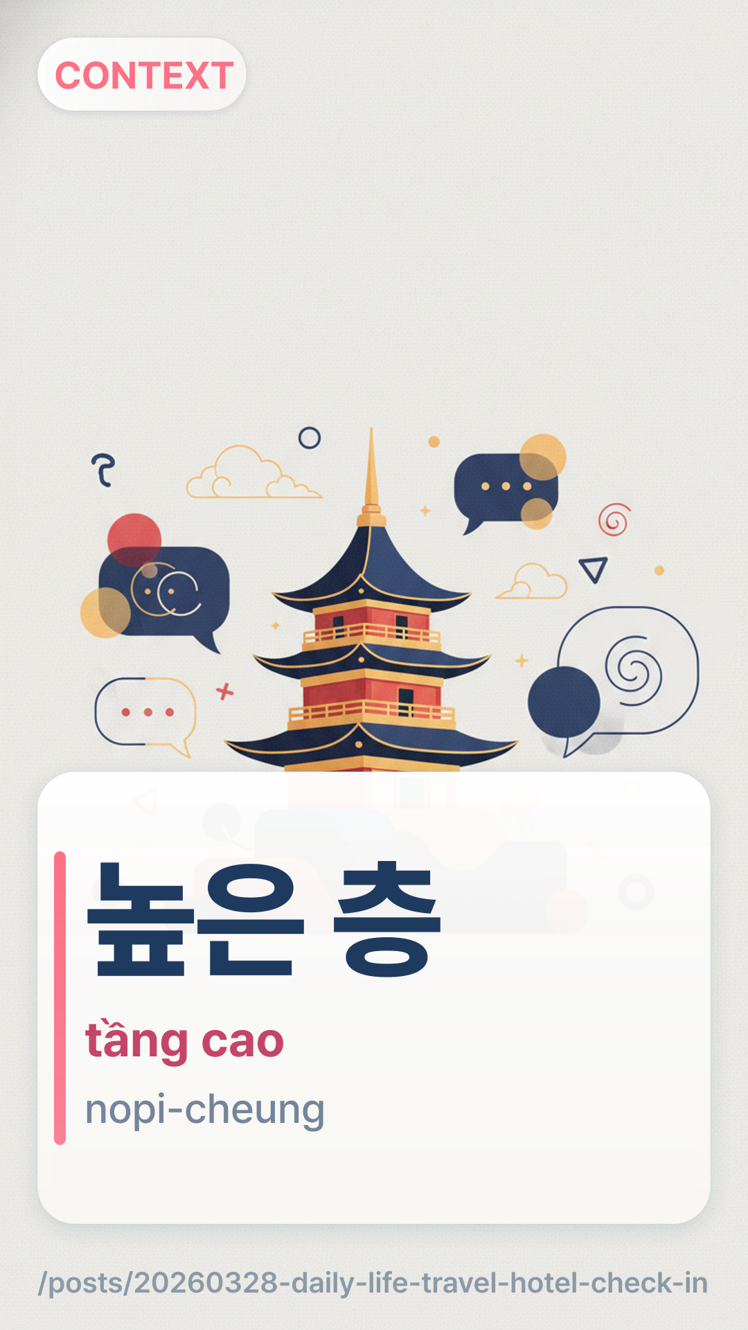 조식josik đề cập cụ thể đến bữa ăn sáng tại khách sạn.체크인chekeuin là danh từ chỉ quá trình đăng ký tại khách sạn khi đến nơi.높은 층nopeun cheung là yêu cầu tiêu chuẩn cho những khách muốn có tầm nhìn tốt hơn hoặc ít tiếng ồn hơn.Khi nói chuyện với nhân viên khách sạn, sử dụng đuôi kết thúc -요-yo là hoàn toàn an toàn và lịch sự. Tuy nhiên, bạn sẽ nhận thấy nhân viên thường trả lời bằng phong cách rất trang trọng -습니다-seupnida. Đừng cảm thấy áp lực phải bắt chước hoàn toàn sự trang trọng của họ; giữ nhất quán với -요-yo là điều tự nhiên đối với khách du lịch. Hãy chú ý các biển báo trong thang máy liệt kê 이용 시간iyong sigan cho phòng xông hơi hoặc quầy bar trên sân thượng!