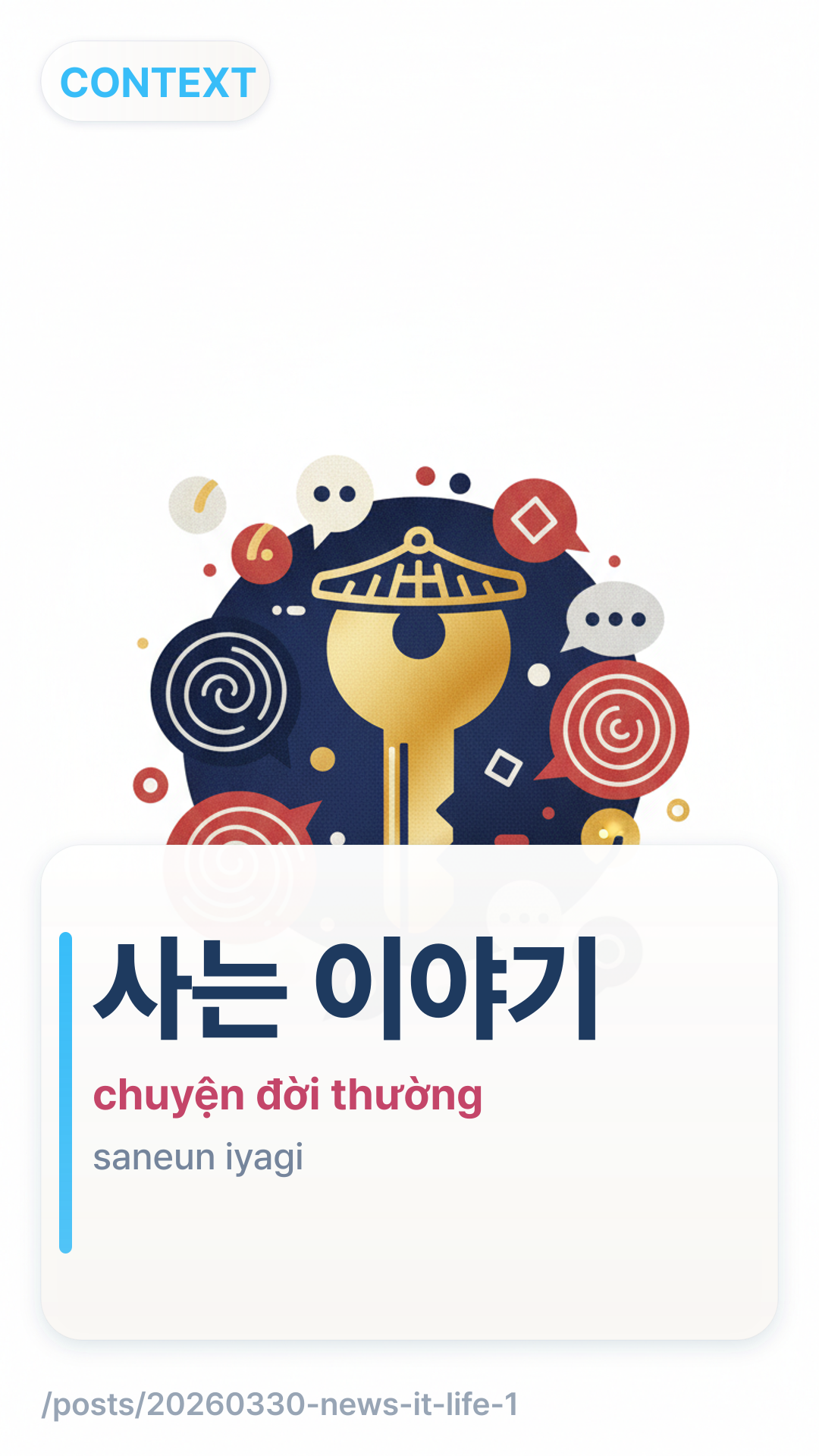 '사는 이야기' (Saneun Iyagi) dịch sát nghĩa là 'những câu chuyện về việc sống' hoặc 'chuyện đời thường'. Trong bối cảnh truyền thông và blog Hàn Quốc, nó đề cập đến những trải nghiệm đời thường, bình dị của những người bình thường—loại nội dung không phải là 'tin nóng' nhưng lại gây được sự đồng cảm sâu sắc.