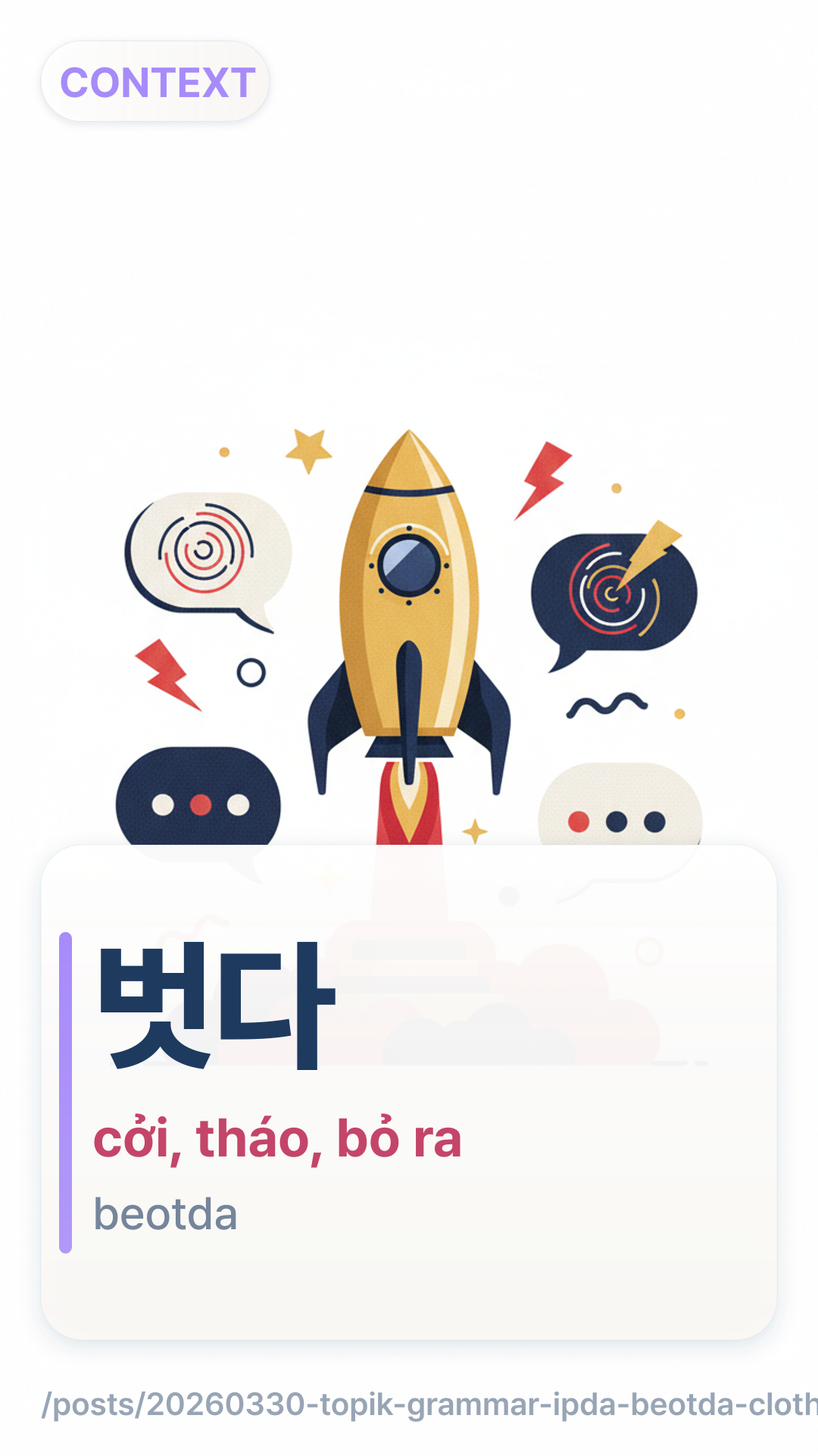 Khác với các động từ 'mặc' vốn rất cụ thể, 벗다beotda là động từ chung cho việc 'cởi', 'tháo' hoặc 'gỡ' bất cứ thứ gì khỏi cơ thể. Cho dù đó là mũ, giày, áo hay thậm chí là kính, bạn đều dùng 벗다beotda.