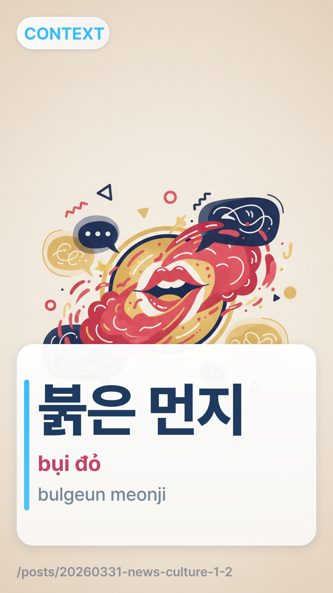 붉은 먼지bulgeun meonji (Bulgeun Meonji) dịch sát nghĩa là 'Bụi đỏ'. Trong bối cảnh tin tức này, nó đề cập đến loại bão bụi cụ thể thường gặp ở các vùng giàu sắt của Úc hoặc Trung Quốc, tạo ra một màn sương đỏ nổi bật về mặt thị giác.