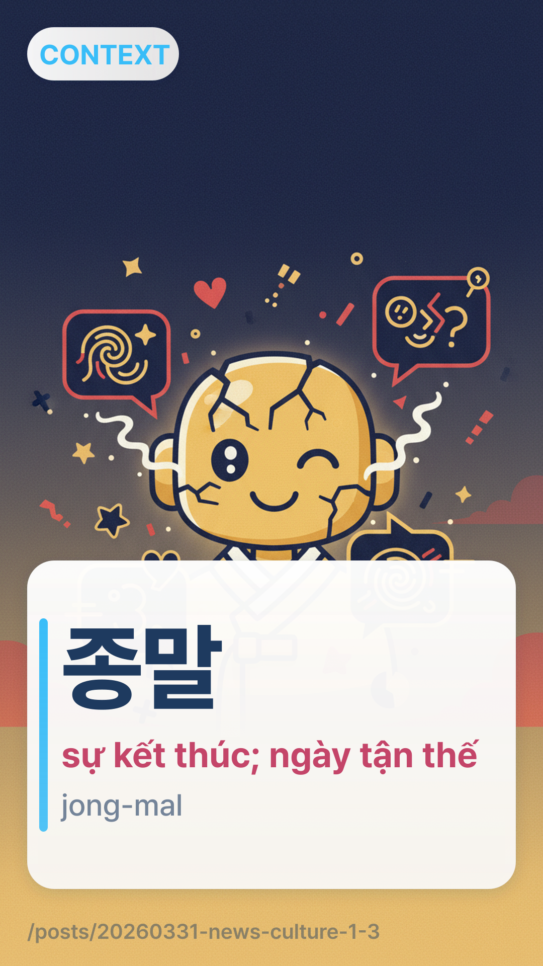 Trong tiêu đề, từ 종말 (jong-mal) được sử dụng để mô tả "sự kết thúc của thế giới" hoặc "ngày tận thế". Nó thường được sử dụng trong bối cảnh phim ảnh (종말 영화) hoặc bối cảnh tôn giáo để mô tả sự kết thúc của thời gian. Trong tin tức này, nó nhấn mạnh bầu trời đỏ trông siêu thực và đáng sợ như thế nào đối với những người trên mặt đất.