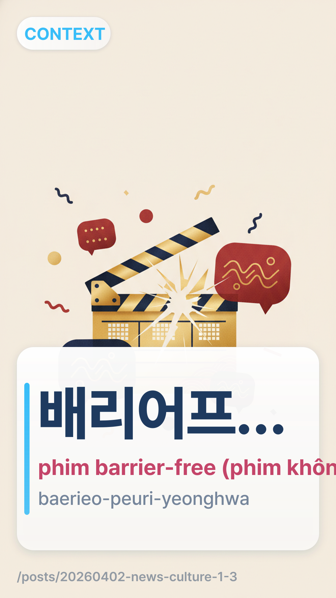 EN brief: 수원시미디어센터-배리어프리영화위원회 업무협약 체결, ‘누구나 함께 보는 영화’ 문화 확산 나선다 (culture) + 1 glossary term.