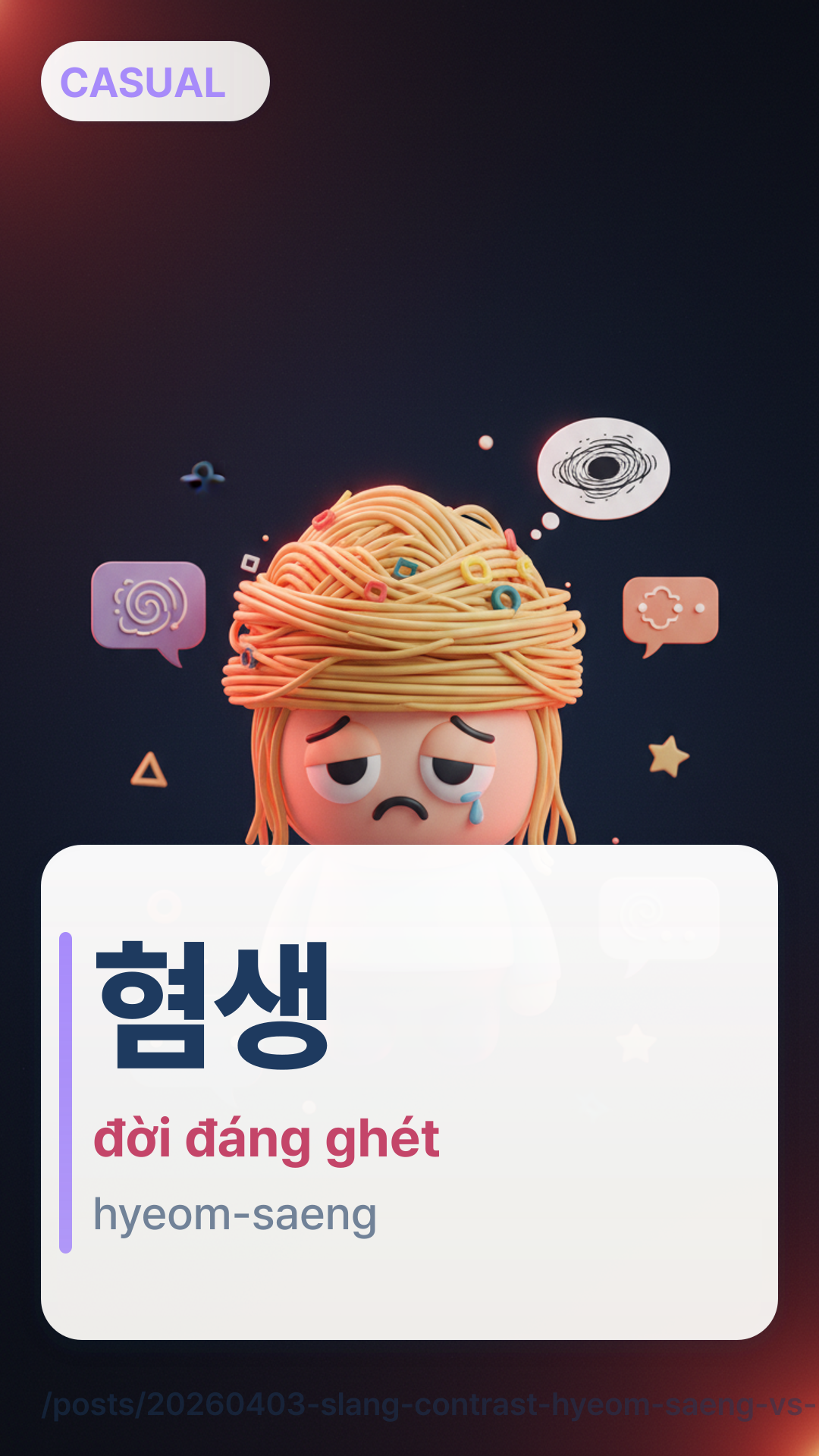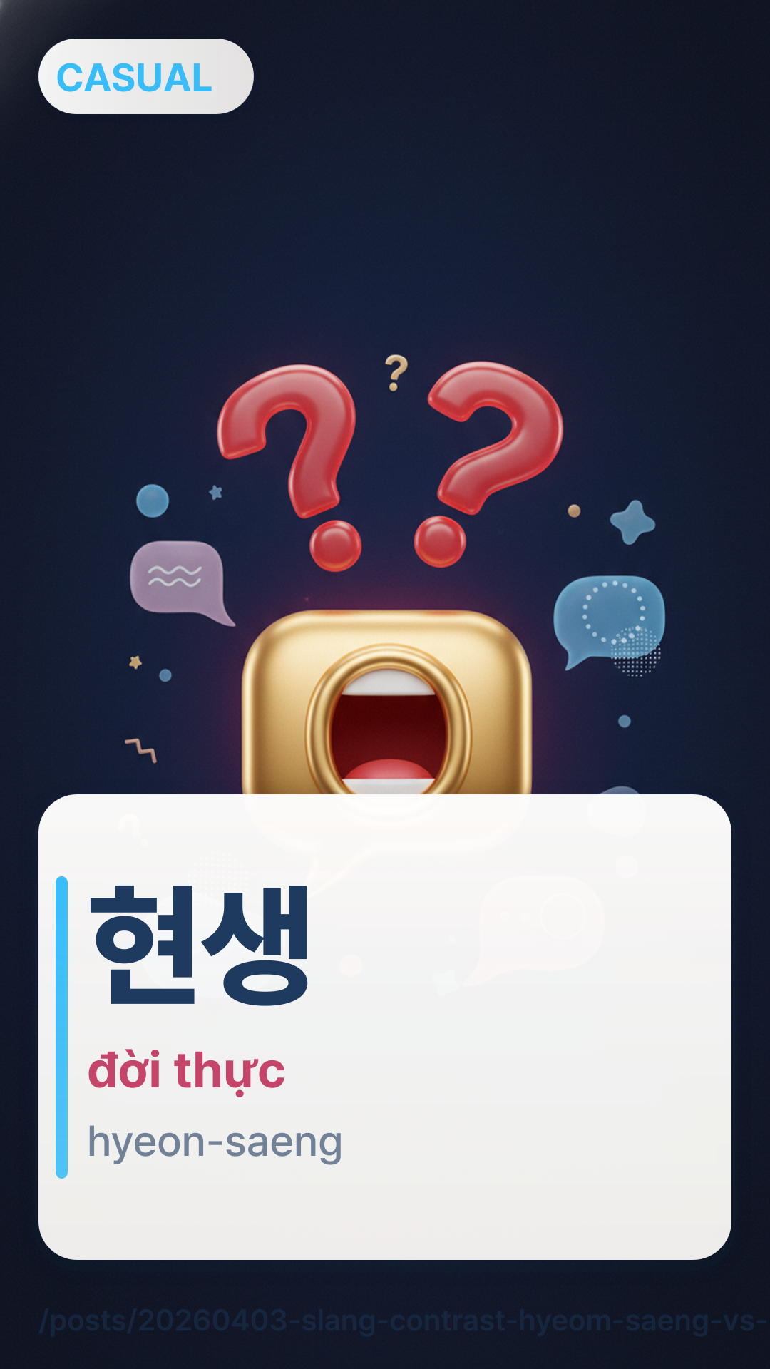 So sánh 현생 (đời thực) và 혐생 (đời đáng ghét). Học cách diễn đạt sự kiệt sức và trách nhiệm hàng ngày qua tiếng lóng Hàn Quốc.