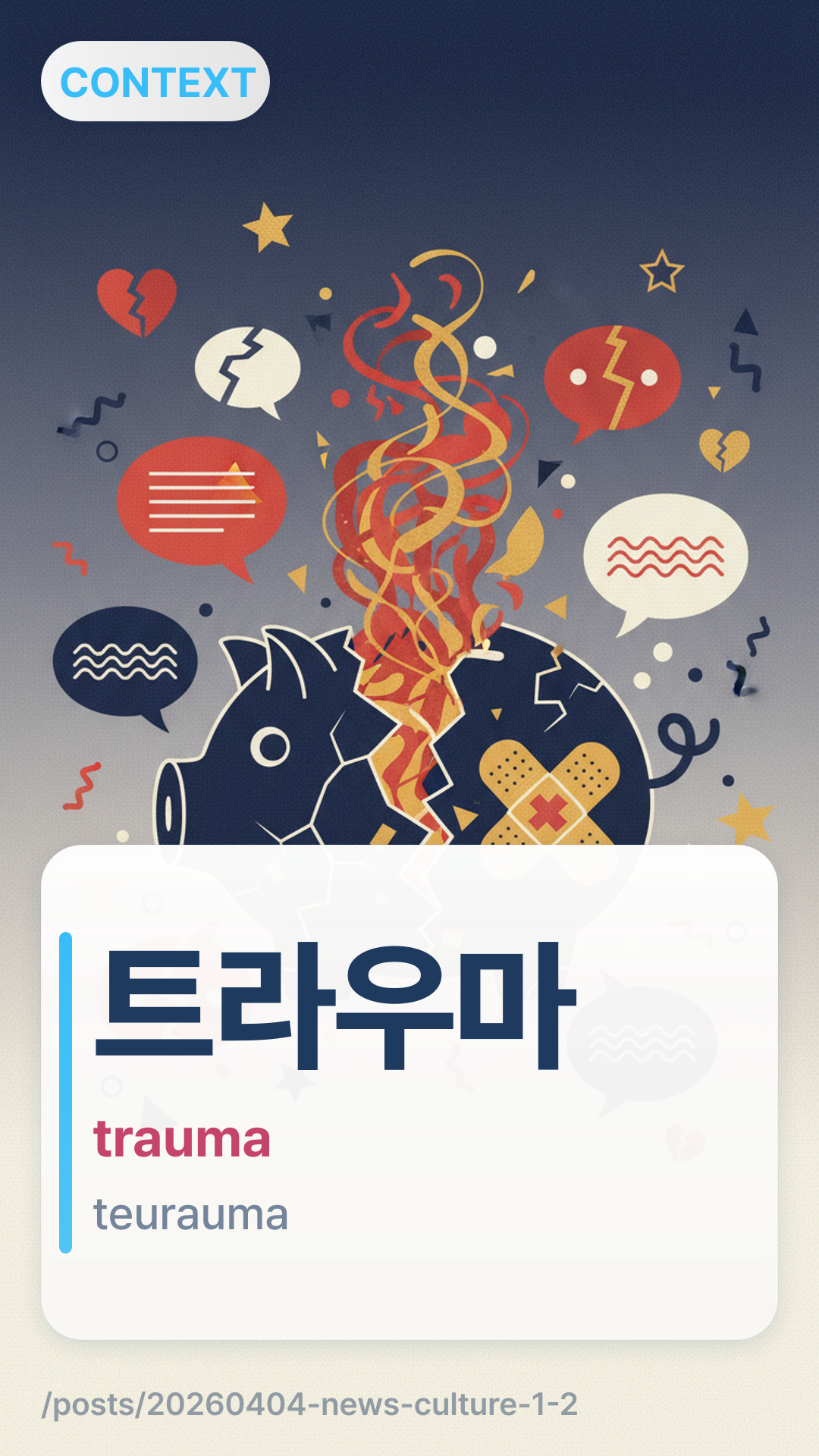 Trong bối cảnh tin tức và tâm lý học Hàn Quốc, 트라우마teurauma (trauma) dùng để chỉ một vết thương cảm xúc kéo dài hoặc cú sốc do một sự kiện đau buồn gây ra. Mặc dù được sử mã tương tự như tiếng Anh, nhưng ở Hàn Quốc, nó thường được kết hợp với các sự kiện lịch sử (như Jeju 4.3 hoặc phà Sewol) để mô tả một vết sẹo tâm lý tập thể của quốc gia hoặc khu vực.