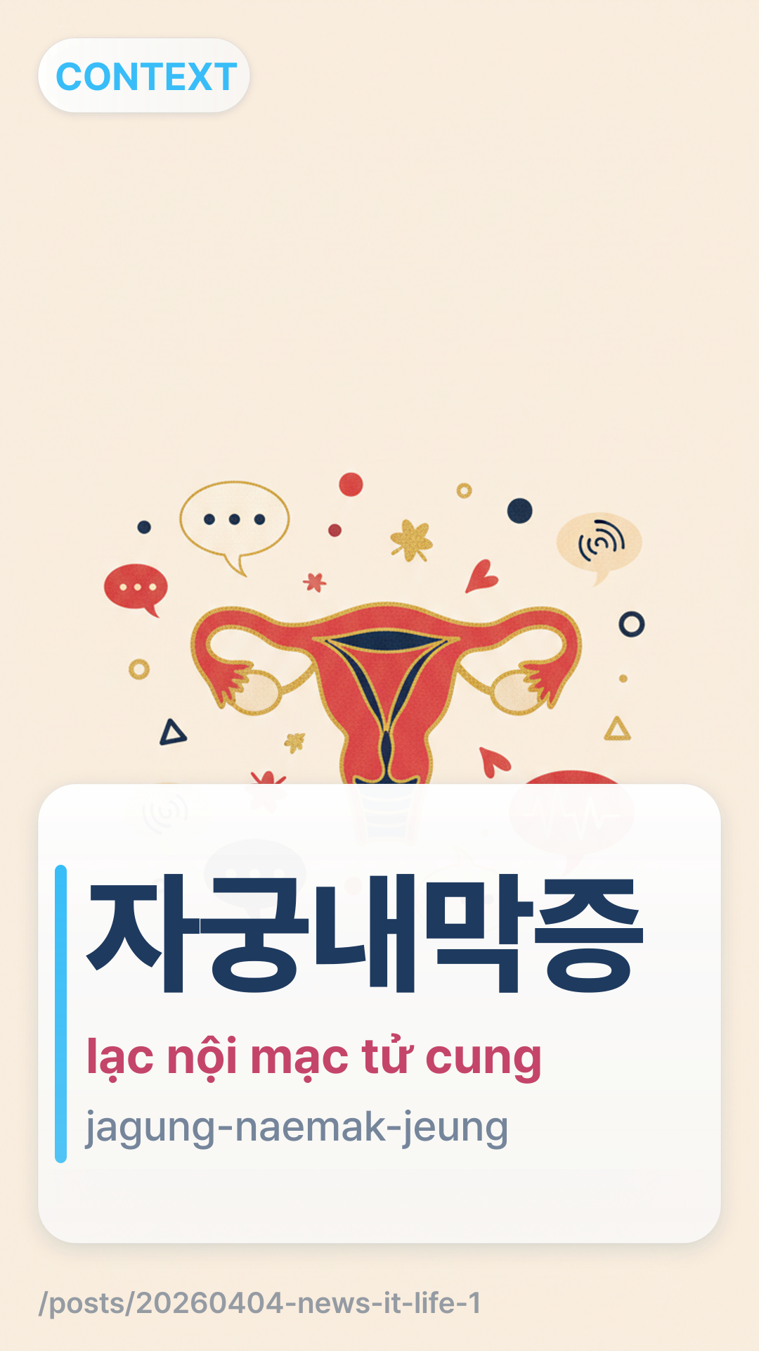 자궁내막증 때문에 병원에 다녀왔어요.jagungnaemakjeung ttaemune byeowone danyeowasseoyo. — Tôi đã đến bệnh viện vì bệnh lạc nội mạc tử cung.