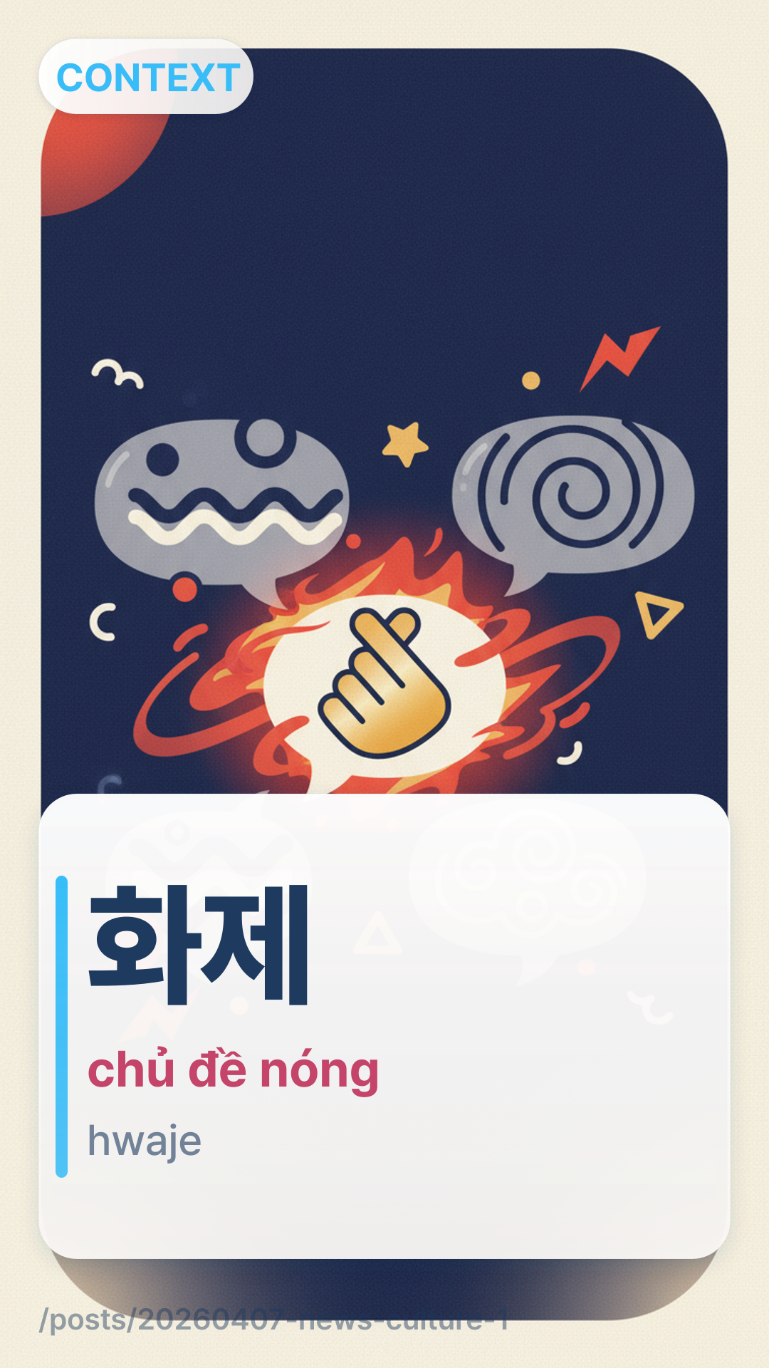 Để nghe giống người bản xứ hơn khi thảo luận về K-drama, hãy thử sử dụng 화제hwaje khi một bộ phim đang thịnh hành trên mạng xã hội. Đây là một thuật ngữ trung tính và chuyên nghiệp được sử dụng thường xuyên trong các báo cáo tin tức cũng như các cuộc trò chuyện thông thường.